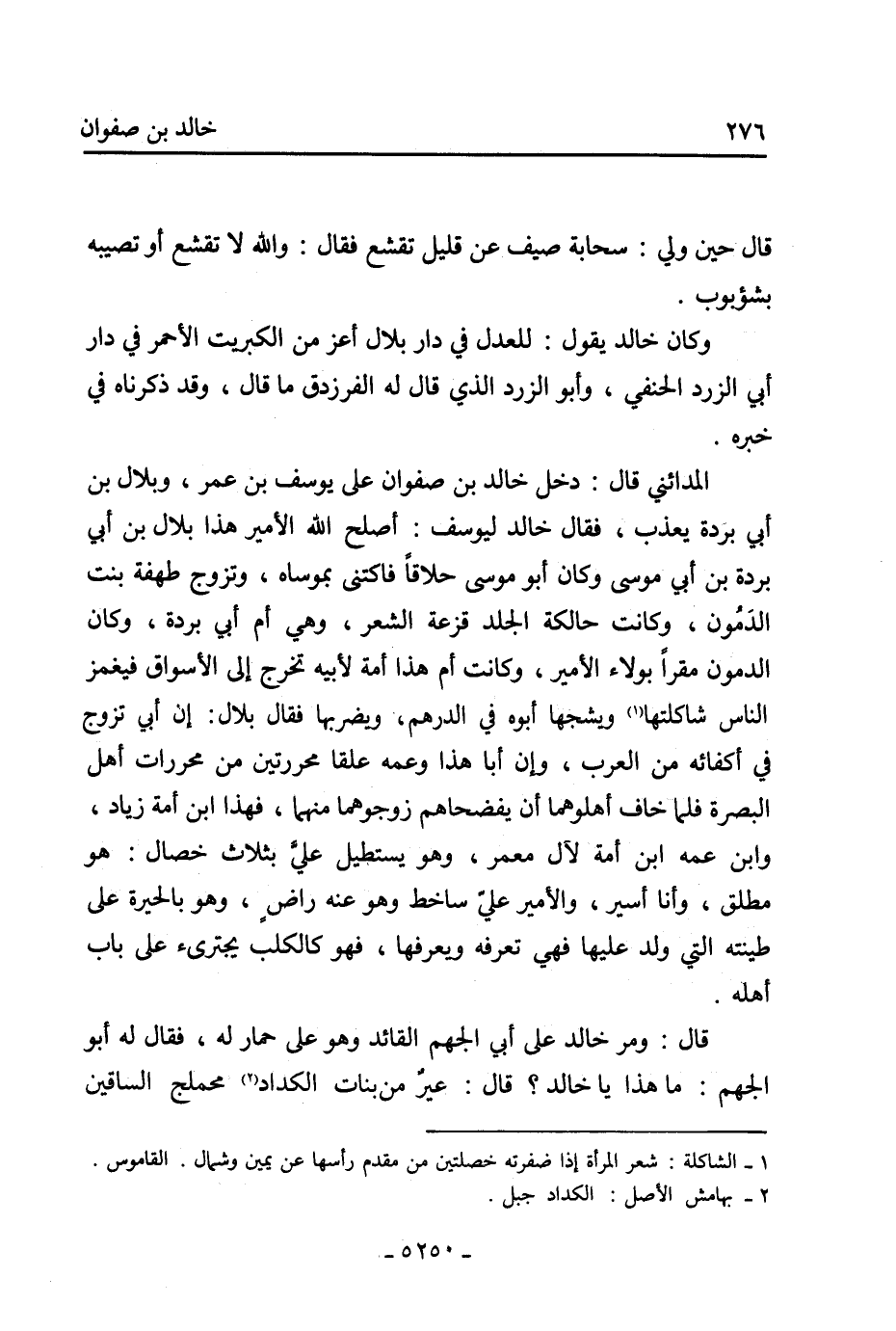 الْمَدَائِنِي قَالَ: دَخَلَ خَالِد بْن صفوان عَلَى يوسف بْن عمر، وبلال بْن أَبِي بردة يعذب، فقال خَالِد ليوسف: أصلح اللَّه الأمير هَذَا بلال بْن أَبِي بردة بْن أَبِي مُوسَى وكان أَبُو مُوسَى حلاقًا فاكتنى بموساه، وتزوج طهفة بِنْت الدَمُون، وكانت حالكة الجلد قزعة الشعر، وهي أم أَبِي بردة، وكان الدمون مقرًا بولاء الأمير، وكانت أم هَذَا أمة لأبية تخرج إلى الأسواق فيغمز الناس شاكلتها [1] ويشجها أَبُوهُ فِي الدرهم، ويضربها فقال بلال: إن أَبِي تزوج فِي أكفائه من العرب، وإن أَبَا هَذَا وعمه علقا محررتين من محررات أَهْل البصرة فَلَمَّا خاف أهلوهما أن يفضحاهم زوجوهما منهما، فهذا ابن أمة زياد، وابن عمه ابن أمة لآل معمر، وهو يستطيل عليَّ بثلاث خصال: هُوَ مطلق، وأنا أسير، والأمير علي ساخط وهو عَنْهُ راضٍ، وهو بالحيرة على طينته التي ولد عليها فهي تعرفه ويعرفها، فهو كالكلب يجترئ على باب أهله.