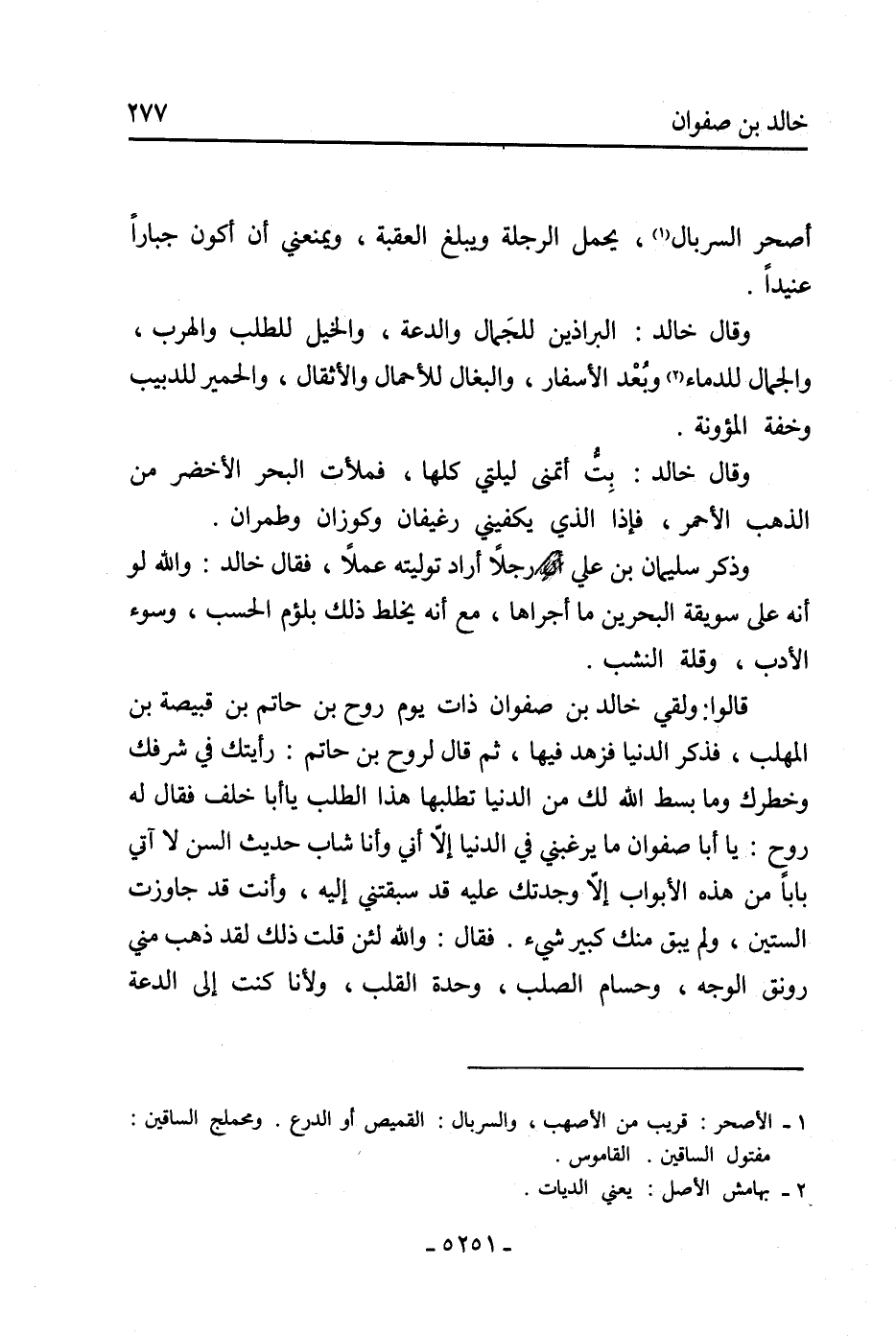 قَالُوا: ولقي خَالِد بْن صفوان ذات يوم روح بْن حاتم بْن قَبِيصَة بْن المهلب، فذكر الدنيا فزهد فيها، ثُمَّ قال لروح بن حاتم: رأيتك فِي شرفك وخطرك وما بسط اللَّه لك من الدنيا تطلبها هَذَا الطلب يا أَبَا خلف فقال له روح: يا أَبَا صفوان ما يرغبني فِي الدنيا إلّا أني وأنا شاب حديث السن لا آتي بابًا من هَذِهِ الأبواب إلّا وجدتك عليه قد سبقتني إليه، وأنت قد جاوزت الستين، ولم يبق منك كبير شيء. فقال: والله لئن قلت ذلك لقد ذهب مني رونق الوجه، وحسام الصلب، وحدة القلب، ولأنا كنت إِلَى الدعة