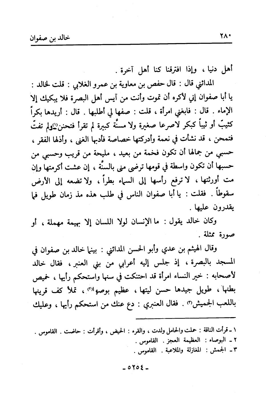وقال الهيثم بْن عدي وأبو الْحَسَن المدائني: بينما خَالِد بْن صفوان فِي المسجد بالبصرة، إذ جلس إليه أعرابي من بني العنبر، فقال خَالِد لأصحابه: خير النساء امْرَأَة قد احتنكت فِي سنها واستحكم رأيها، خميص بطنها، طويل جيدها حسن ليتها، عظيم بوصها [2] ، تملأ كف قرينها باللعب الجميش [3] . فقال العنبري: دع عنك من استحكم رأيها، وعليك