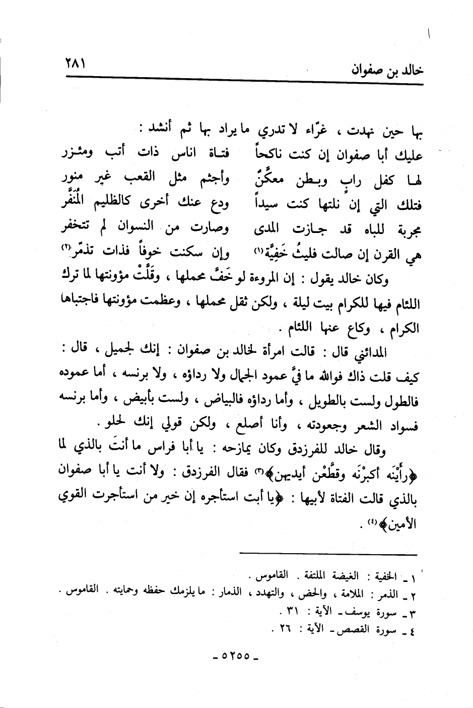 وقال خَالِد للفرزدق وكان يمازحه: يا أبا فراس ما أنت بالذي لما رأينه أكبرنه وقطّعن أيديهن [3] فقال الفرزدق: ولا أنت يا أبا صفوان بالذي قَالَتِ الفتاة لأبيها: يَا أَبَتِ اسْتَأْجِرْهُ إِنَّ خَيْرَ مَنِ اسْتَأْجَرْتَ الْقَوِيُّ الأَمِينُ [4] .