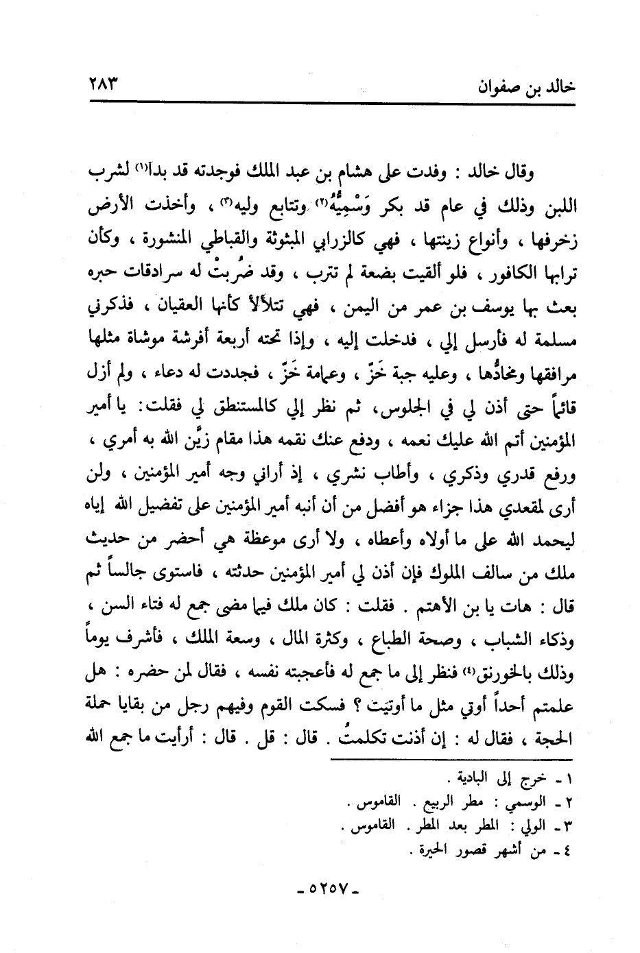 وقال خَالِد: وفدت على هشام بْن عَبْد الملك فوجدته قد بدا [1] لشرب اللبن وذلك فِي عام قد بَكْر وَسْمِيُّهُ [2] وتتابع وليه [3] ، وأخذت الأرض زخرفها، وأنواع زينتها، فهي كالزرابي المبثوثة والقباطي المنشورة، وكأن ترابها الكافور، فلو ألقيت بضعة لم تترب، وقد ضُربتْ له سرادقات حبره بعث بها يوسف بْن عُمَر من اليمن، فهي تتلألأ كأنها العقيان، فذكرني مسلمة له فأرسل إلي، فدخلت إليه، وَإِذَا تحته أربعة أفرشة موشاة مثلها مرافقها ومخادُّها، وعليه جبة خَزّ، وعمامة خَزّ، فجددت له دعاء، ولم أزل قائمًا حَتَّى أذن لي فِي الجلوس، ثُمَّ نظر إِلَي كالمستنطق لي فقلت: يا أمير المؤمنين أتم اللَّه عليك نعمه، ودفع عنك نقمه هَذَا مقام زيَّن اللَّه به أمري، ورفع قدري وذكري، وأطاب نشري، إذ أراني وجه أمير المؤمنين، ولن أرى لمقعدي هَذَا جزاء هُوَ أفضل من أن أنبه أمير المؤمنين على تفضيل اللَّه إياه ليحمد اللَّه على ما أولاه وأعطاه، ولا أرى موعظة هِيَ أحضر من حديث ملك من سالف الملوك فَإِن أذن لي أمير المؤمنين حدثته، فاستوى جالسًا ثُمَّ قال: هات يا بن الأهتم. فقلت: كان ملك فيما مضى جمع له فتاء السن، وذكاء الشباب، وصحة الطباع، وكثرة المال، وسعة الملك، فأشرف يومًا وذلك بالخورنق [4] فنظر إِلَى ما جمع له فأعجبته نفسه، فقال لمن حضره: هَلْ علمتم أحدًا أوتي مثل ما أوتيت؟ فسكت القوم وفيهم رَجُل من بقايا حملة الحجة، فقال له: إن أذنت تكلمتُ. قال: قل. قال: أرأيت ما جمع الله