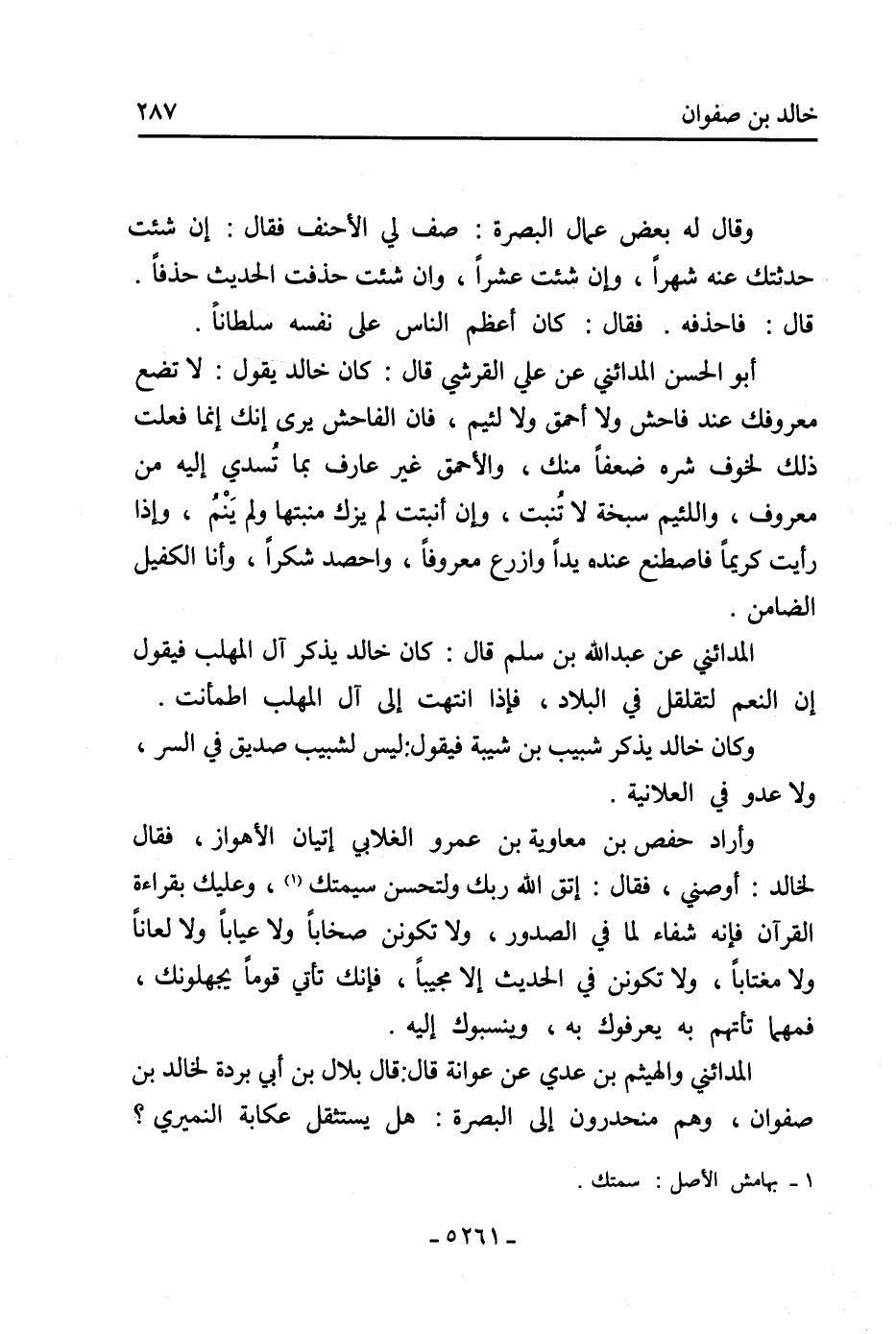 وأراد حَفْص بْن مُعَاوِيَة بْن عمرو الغلابي إتيان الأهواز، فقال لخالد: أوصني، فقال: اتق اللَّه ربك ولتحسن سيمتك [1] ، وعليك بقراءة القرآن فإنه شفاء لما فِي الصدور، ولا تكونن صخابًا ولا عيابًا ولا لعانًا ولا مغتابًا، ولا تكونن فِي الحديث إلا مجيبا، فإنك تأتي قومًا يجهلونك، فمهما تأتهم به يعرفوك به، وينسبوك إليه.
