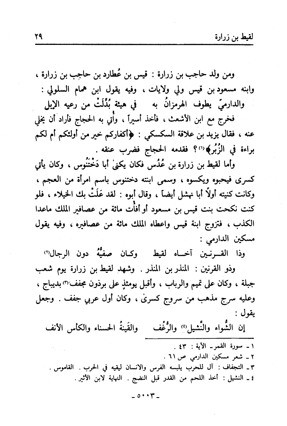 وذو القرنين: المنذر بْن المنذر. وشهد لقيط بْن زرارة يوم شعب جبلة، وكان على تميم والرباب، وأقبل يومئذٍ على برذون مجفف [3] بديباج، وعليه سرج مذهب من سروج كسرى، وكان أول عربي جفف. وجعل يقول: