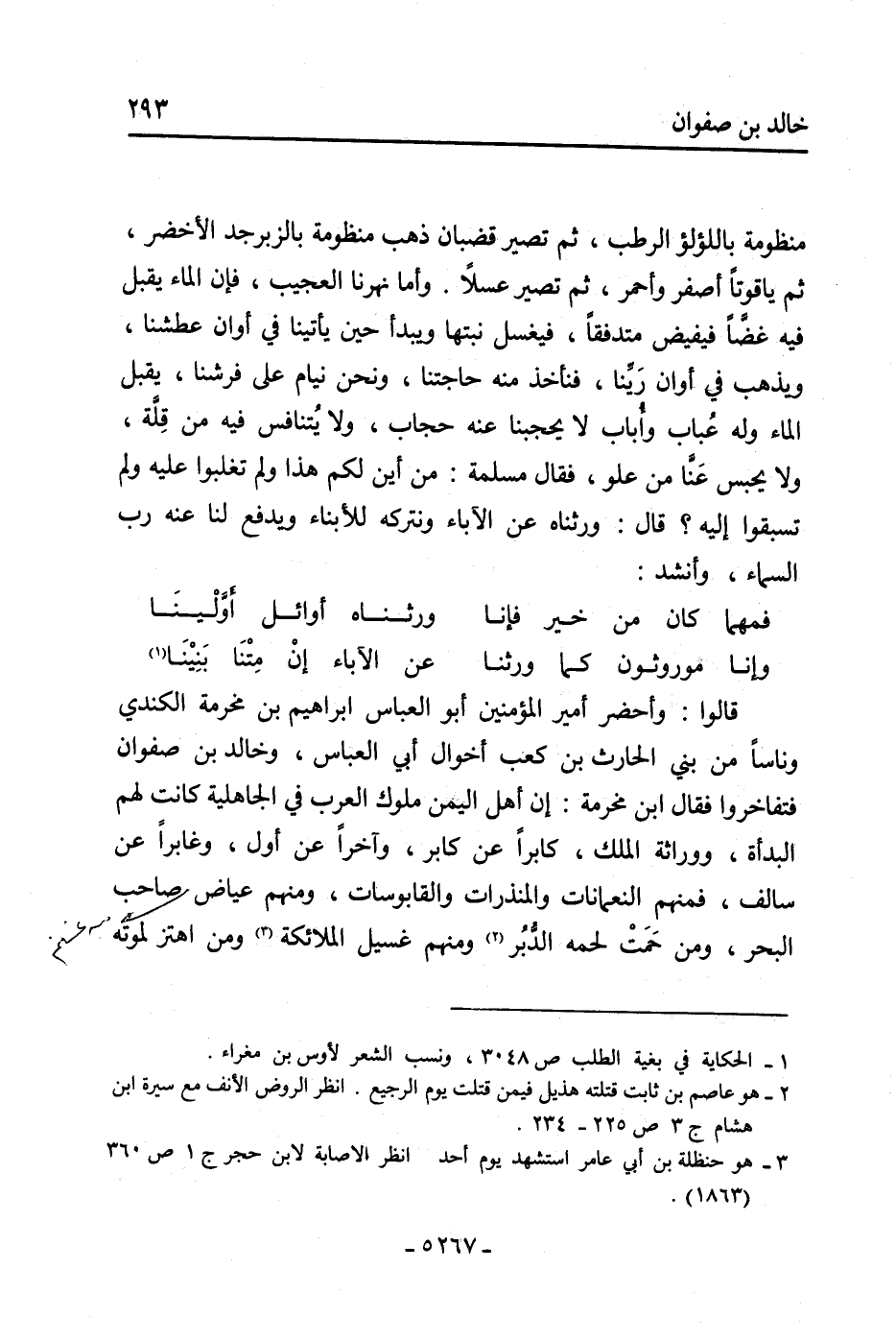منظومة باللؤلؤ الرطب، ثُمَّ تصير قضبان ذهب منظومة بالزبرجد الاخضر، ثُمَّ ياقوتًا أصفر وأحمر، ثُمَّ تصير عسلًا. وأما نهرنا العجيب، فَإِن الماء يقبل فِيهِ غضًّا فيفيض متدفقًا، فيغسل نبتها ويبدأ حين يأتينا فِي أوان عطشنا، ويذهب فِي أوان رَيِّنا، فنأخذ منه حاجتنا، ونحن نيام على فرشنا، يقبل الماء وله عُباب وأُباب لا يحجبنا عَنْهُ حجاب، ولا يُتنافس فِيهِ من قِلَّة، ولا يحبس عَنَّا من علو، فقال مسلمة: من أَيْنَ لكم هَذَا ولم تغلبوا عليه ولم تسبقوا إليه؟ قال: ورثناه عن الآباء ونتركه للأبناء ويدفع لنا عَنْهُ رب السماء، وأنشد: