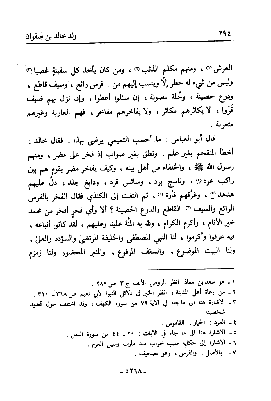 العرش [1] ، ومنهم مكلم الذئب [2] ، ومن كان يأخذ كل سفينةٍ غصبا [3] وليس من شيء له خطر إلّا وينسب إليهم من: فرس رائع، وسيف قاطع، ودرع حصينة، وحُلة مصونة، إن سئلوا أعطوا، وإن نزل بهم ضيف قَرَوا، لا يكاثرهم مكاثر، ولا يفاخرهم مفاخر، فهم العاربة وغيرهم متعربة.