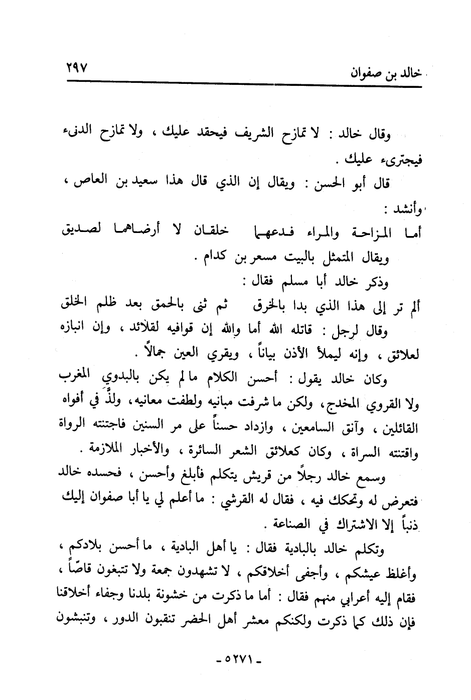وتكلم خَالِد بالبادية فقال: يا أَهْل البادية، ما أحسن بلادكم، وأغلظ عيشكم، وأجفى أخلاقكم، لا تشهدون جمعة ولا تتبغون قاصًا، فقام إليه أعرابي منهم فقال: أما ما ذكرت من خشونة بلدنا وجفاء أخلاقنا فَإِن ذلك كما ذكرت ولكنكم معشر أَهْل الحضر تنقبون الدور، وتنبشون