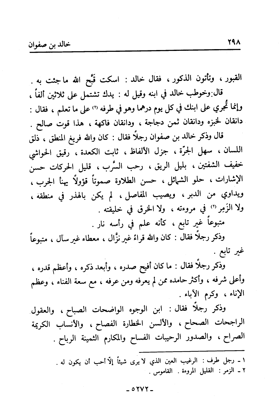 قال وذكر خالد بْن صفوان رجلًا فقال: كان والله فريغ المنطق، ذلق اللسان، سهل الجرة، جزل الألفاظ، ثابت الكعدة، رقيق الحواشي خفيف الشفتين، بليل الريق، رحب السرب، قليل الحركات حسن الإشارات، حلو الشمائل، حسن الطلاوة صموتًا قؤولا يهنأ الجرب، ويداوي من الدبر، ويصيب المفاصل، لم يكن بالهذر فِي منطقه، ولا الزّمِر [2] فِي مروءته، ولا الخرق فِي خليقته.