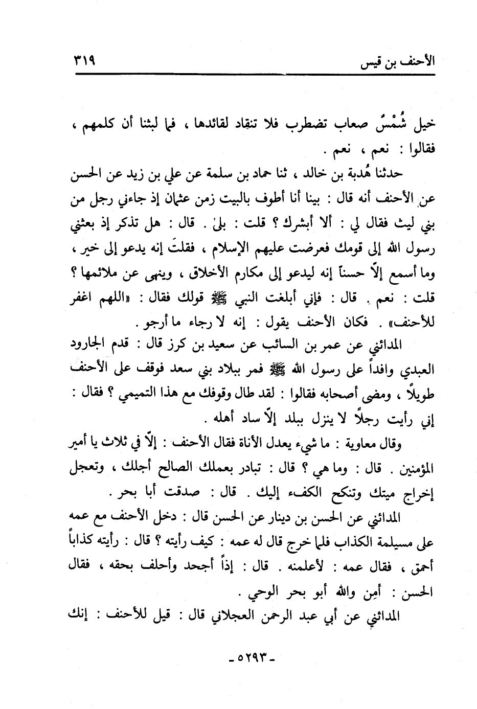 حَدَّثَنَا هُدْبَةُ بْنُ خَالِدٍ، ثَنَا حَمَّادُ بْنُ سَلَمَةَ عن علي بن زيد عن الحسن عَنِ الأَحْنَفِ أَنَّهُ قَالَ: بَيْنَا أَنَا أَطُوفُ بِالْبَيْتِ زَمَنَ عُثْمَانَ إِذْ جَاءَنِي رَجُلٌ مِنْ بَنِي لَيْثٍ فَقَالَ لِي: أَلا أُبَشِّرُكَ؟ قُلْتُ: بَلَى. قَالَ: هَلْ تَذْكُرُ إِذْ بَعَثَنِي رَسُولُ اللَّهِ إِلَى قَوْمِكَ فَعَرَضْتُ عَلَيْهِمُ الإِسْلامَ، فَقُلْتَ إِنَّهُ يَدْعُو إِلَى خَيْرٍ، وَمَا أَسْمَعُ إِلا حَسَنًا إِنَّهُ لَيَدْعُو إِلَى مَكَارِمِ الأَخْلاقِ، وَيَنْهَى عَنْ مَلائِمِهَا؟