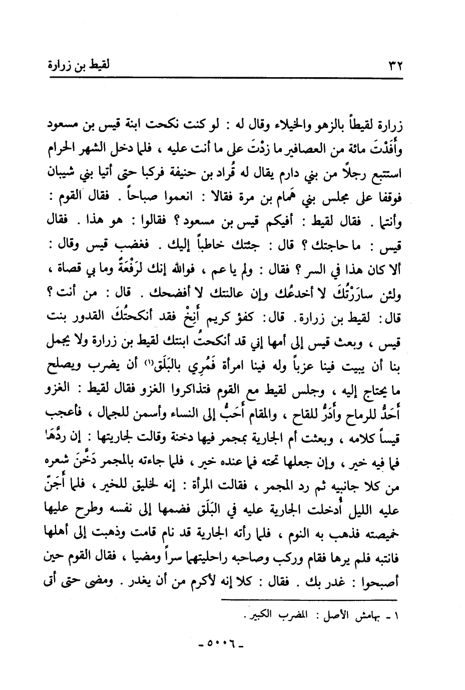 زرارة لقيطًا بالزهو والخيلاء وقال له: لو كنت نكحت ابْنَة قَيْس بْن مَسْعُود وأَفَدْتَ مائة من العصافير ما زدْتَ على ما أنت عليه، فَلَمَّا دخل الشهر الحرام استتبع رجلًا من بني دارم يُقَالُ له قُراد بْن حنيفة فركبا حَتَّى أتيا بني شَيْبَان فوقفا على مجلس بني هَمام بْن مرة فقالا: انعموا صباحًا. فقال القوم: