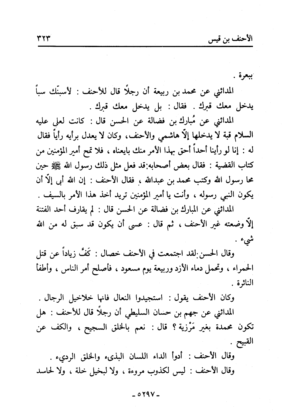 المدائني عَنِ الْمُبَارَكِ بْنِ فَضَالَةَ عَنِ الْحَسَنِ قَالَ: لم يقارف أحد الفتنة إلا وضعته غير الأحنف، ثُمَّ قال: عسى أن يكون قد سبق له من اللَّه شيء.