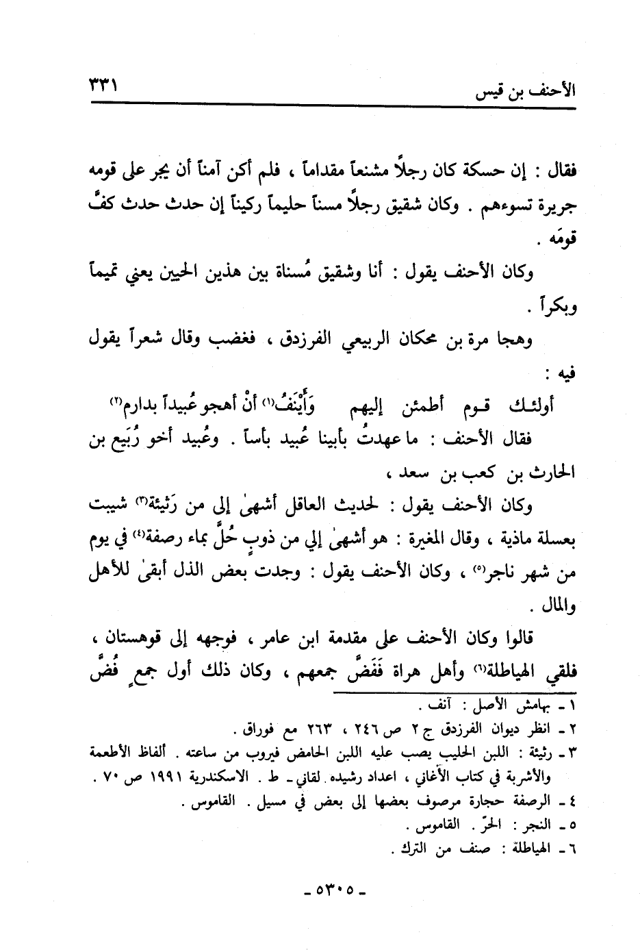 فقال الأحنف: ما عهدتُ بأبينا عُبيد بأسًا. وعُبيد أخو رُبَيع بْن الْحَارِث بْن كعب بْن سعد، وكان الأحنف يقول: لحديث العاقل أشهى إِلَى من رَثيئة [3] شيبت بعسلة ماذية، وقال المغيرة: هو هُوَ أشهى إلي من ذوبٍ حُلَّ بماء رصفة [4] فِي يوم من شهر ناجر [5] ، وكان الأحنف يقول: وجدت بعض الذل أبقى للأهل والمال.