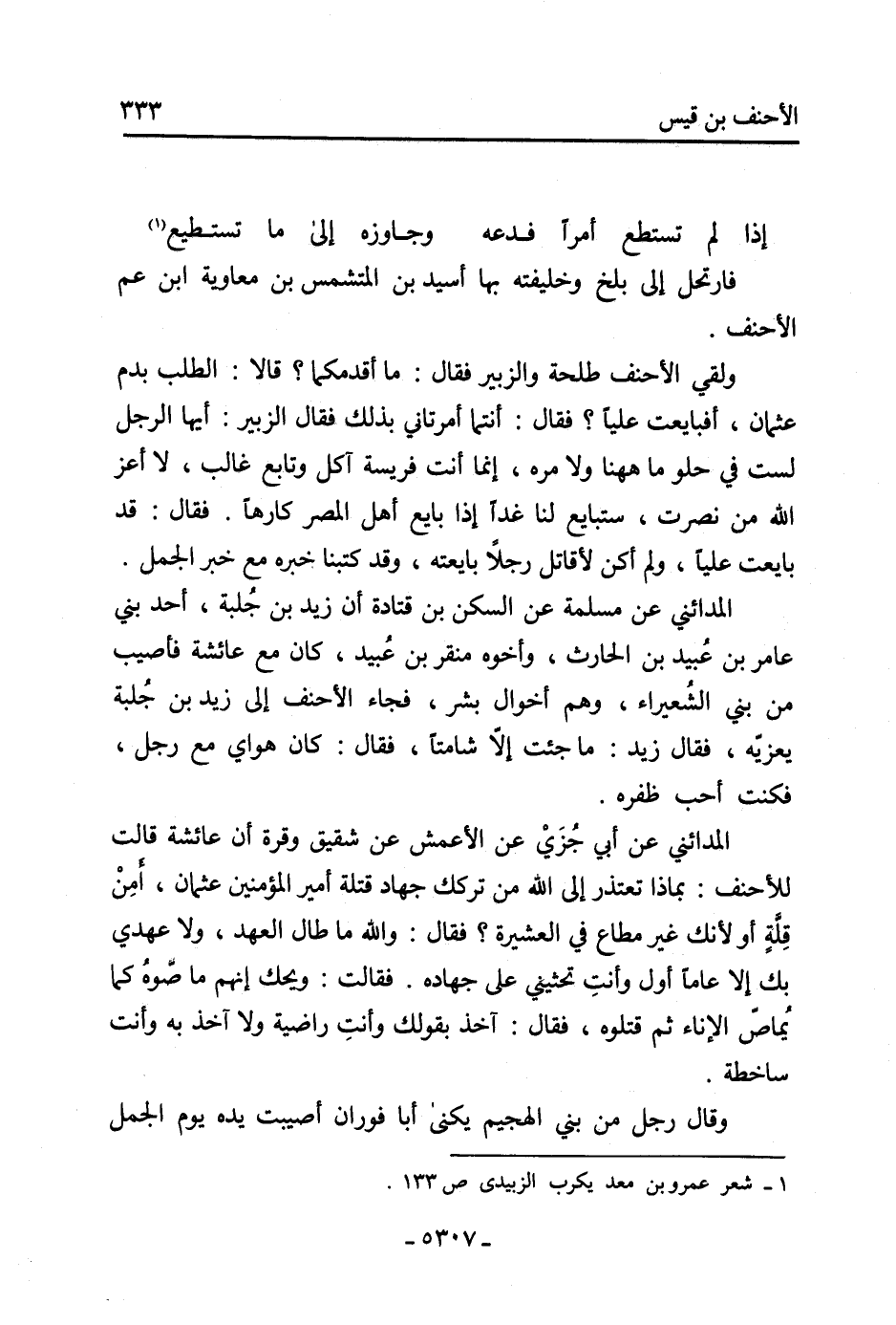الْمَدَائِنِيُّ عَنْ أَبِي جُزَيٍّ عَنِ الأَعْمَشِ عَنْ شَقِيقٍ وَقُرَّةَ أَنَّ عَائِشَةَ قَالَتْ لِلأَحْنَفِ: بِمَاذَا تَعْتَذِرُ إِلَى اللَّهِ مِنْ تَرْكِكَ جِهَادَ قَتَلَةِ أَمِيرِ الْمُؤْمِنِينَ عُثْمَانَ، أَمِنْ قِلَّةٍ أَوْ لأَنَّكَ غَيْرُ مُطَاعٍ فِي الْعَشِيرَةِ؟ فَقَالَ: وَاللَّهِ مَا طَالَ الْعَهْدُ، وَلا عَهْدِي بِكِ إِلا عَامًا أَوَّلَ وَأَنْتِ تَحُثِّينِي عَلَى جِهَادِهِ. فَقَالَتْ: وَيْحَكَ إِنَّهُمْ مَاصُّوهُ كَمَا يُمَاصُّ الإِنَاءُ ثُمَّ قَتَلُوهُ، فَقَالَ: آخَذُ بِقَوْلِكِ وَأَنْتِ رَاضِيَةٌ وَلا آخَذُ بِهِ وَأَنْتِ سَاخِطَةٌ.