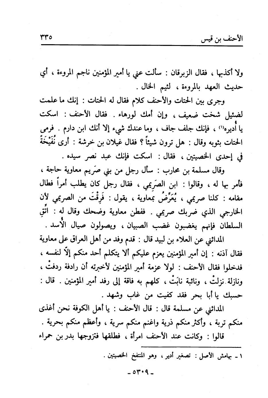 وجرى بين الحتات والأحنف كلام فقال له الحتات: إنك ما علمت لضئيل شخت ضعيف، وإن أمك لورهاء. فقال الأحنف: اسكت يا أُديره [1] ، فإنك جلف جاف، وما عندك شيء إلا أنك ابن دارم. فرمى الحتات بثوبه وقال: هَلْ ترون شيئًا؟ فقال غيلان بْن خرشة: أرى نُفَيْخَةً فِي إحدى الخصيتين، فقال: اسكت فإنك عَبْد نصر سيده.