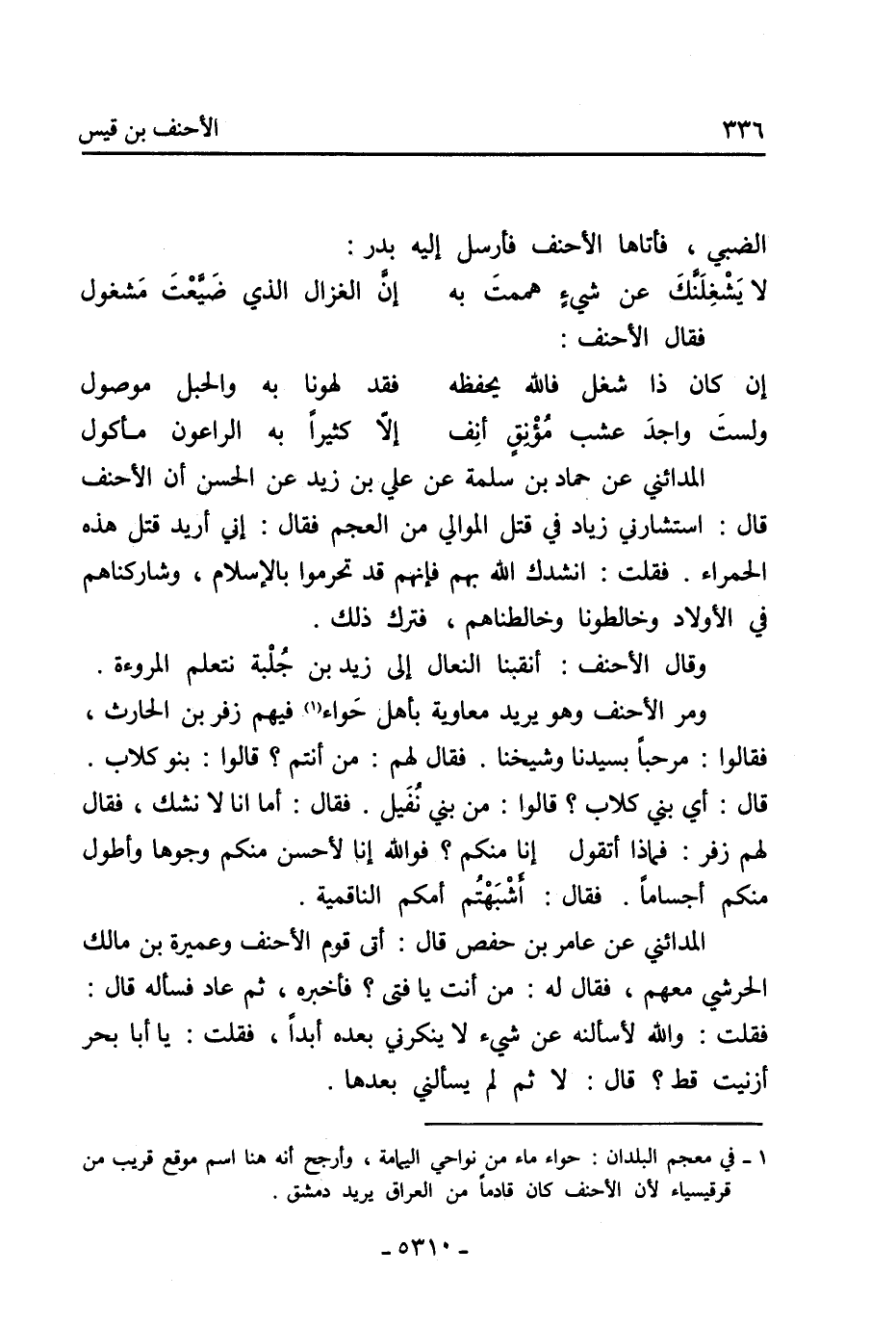 [1] في معجم البلدان: حواء ماء من نواحي اليمامة، وأرجح أنه هنا اسم موقع قريب من قرقيسياء لأن الأحنف كان قادما من العراق يريد دمشق.
