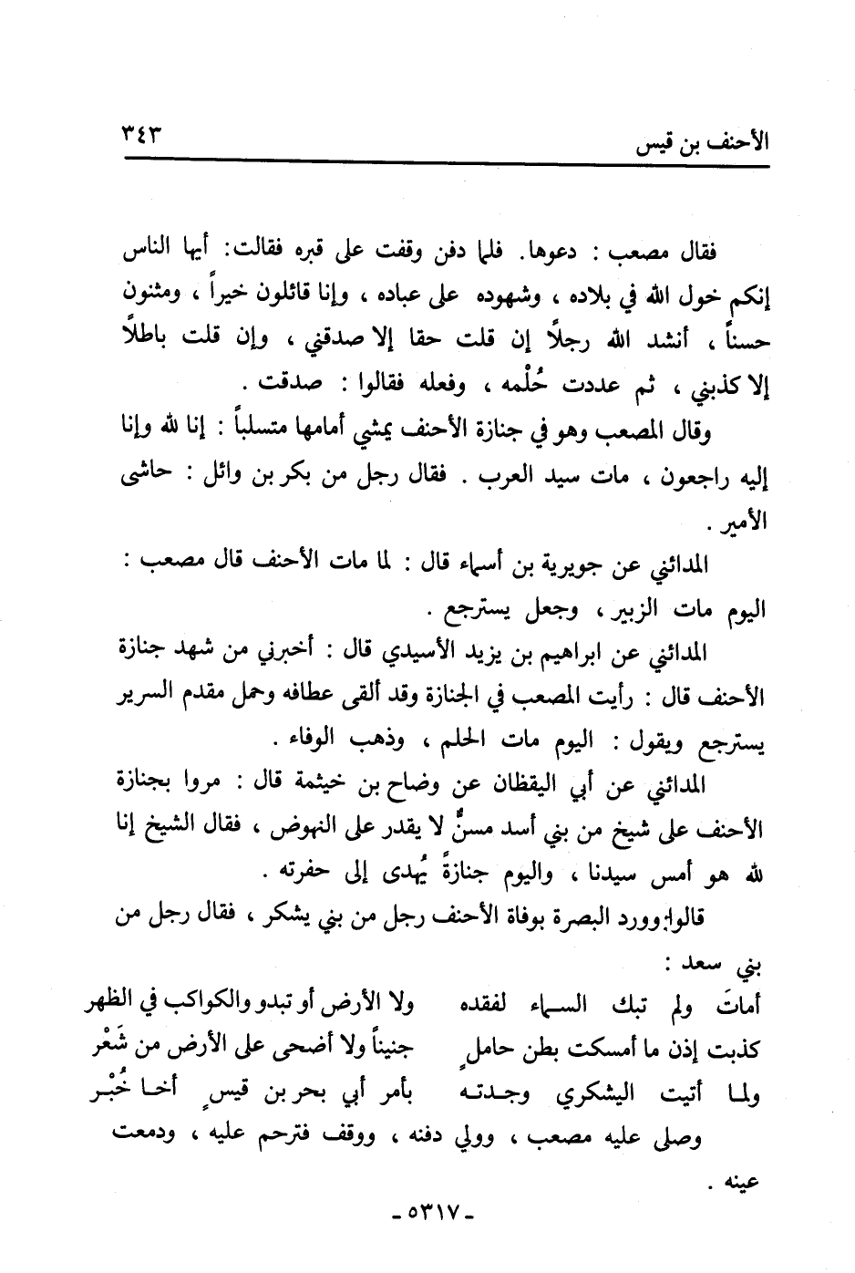 وقال المصعب وهو فِي جنازة الأحنف يمشي أمامها متسلبًا: إنا لله وإنا إليه راجعون، مات سيد العرب. فقال رَجُل من بَكْر بْن وائل: حاشي الأمير.