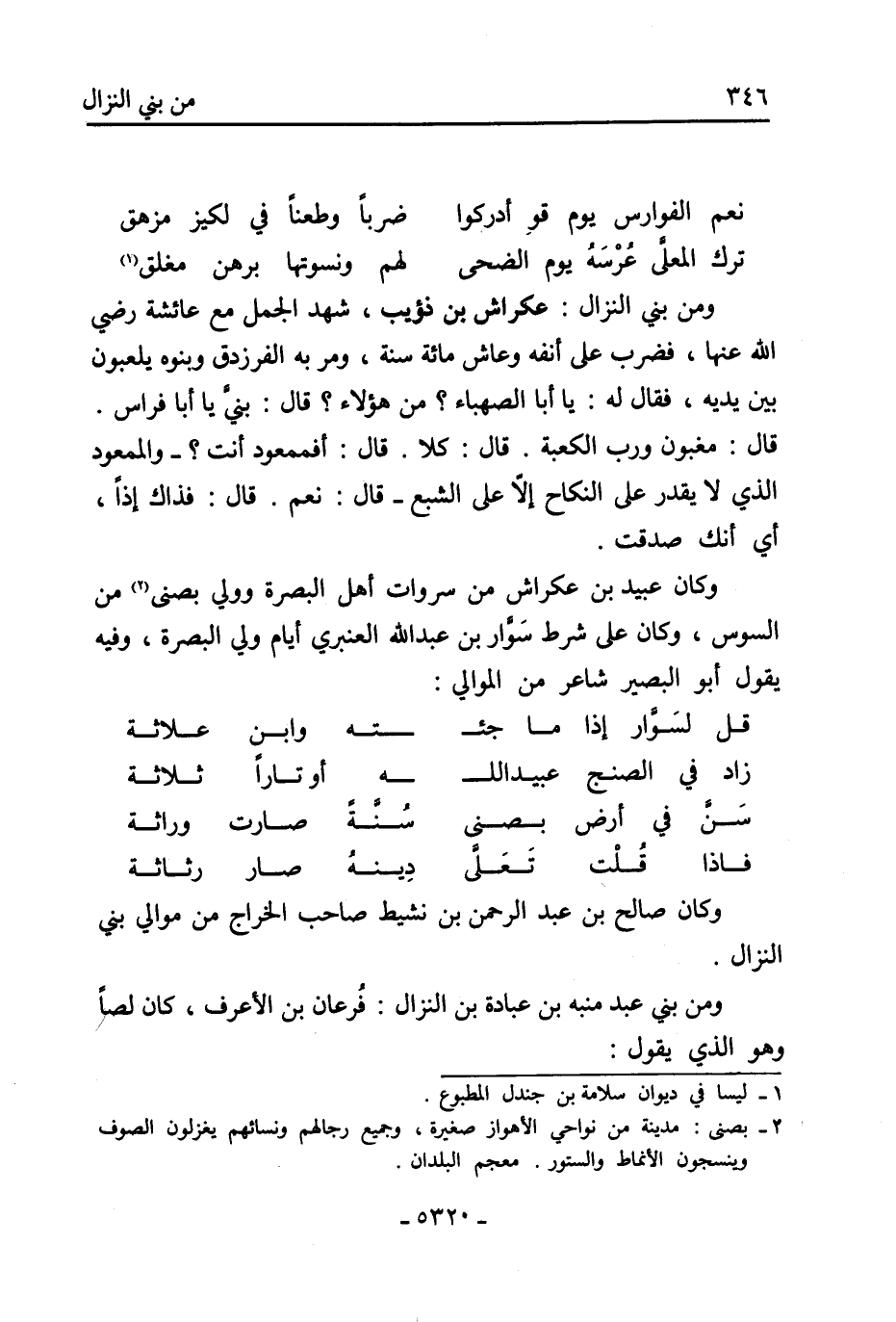 ومن بني النزال: عكراش بْن ذؤيب، شهد الجمل مع عَائِشَة رَضِيَ اللَّه عَنْهَا، فضرب على أنفه وعاش مائة سنة، ومر به الفرزدق وبنوه يلعبون بين يديه، فقال له: يا أَبَا الصهباء؟ من هؤلاء؟ قال: بني يا أَبَا فراس.