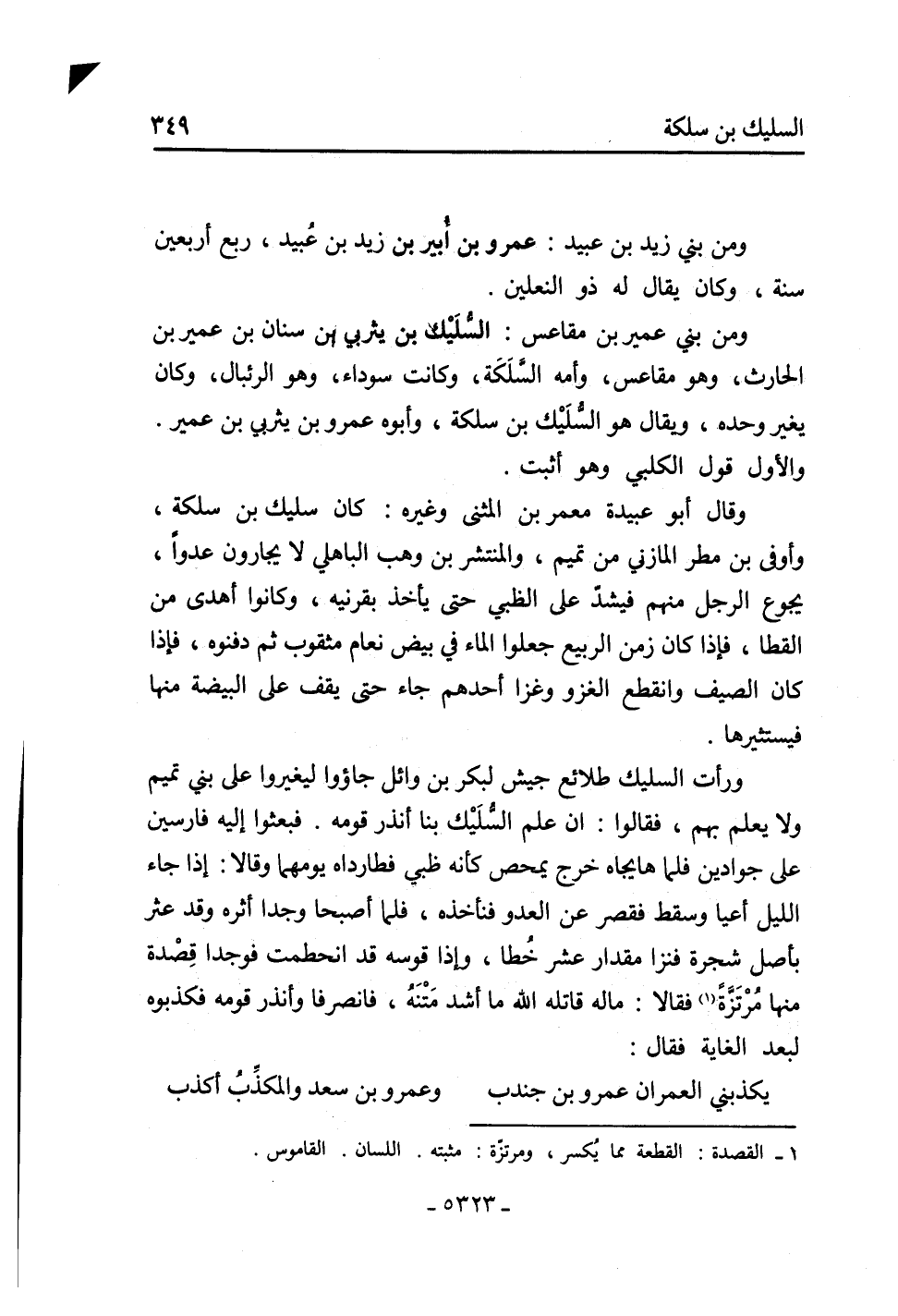 ورأت السليك طلائع جيش لبكر بْن وائل جاؤوا ليغيروا على بني تميم ولا يعلم بهم، فقالوا: إن علم السُّلَيْك بنا أنذر قومه. فبعثوا إليه فارسين على جوادين فَلَمَّا هايجاه خرج يمحص كأنه ظبي فطارداه يومهما وقالا: إذا جاء الليل أعيا وسقط فقصر عن العدو فنأخذه، فَلَمَّا أصبحا وجدا أثره وقد عثر بأصل شجرة فنزا مقدار عشر خُطا، وَإِذَا قوسه قد انحطمت فوجدا قِصْدة منها مُرْتَزَّةً [1] فقالا: ماله قاتله اللَّه ما أشد مَتْنَهُ، فانصرفا وأنذر قومه فكذبوه لبعد الغاية فقال: