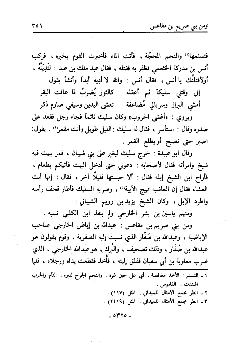صاحب الإباضية، وعبد اللَّه بْن صَفّار الَّذِي نسبت إليه الصفرية، وقوم يقولون هُوَ عَبْد اللَّه بْن صُفَار، وذلك تصحيف، والبُرك، هُوَ عَبْد اللَّه الخارجي، الَّذِي ضرب مُعَاوِيَة بْن أَبِي سُفْيَان ففلق إليته، فأُخذ فقطعت يداه ورجلاه، فلما