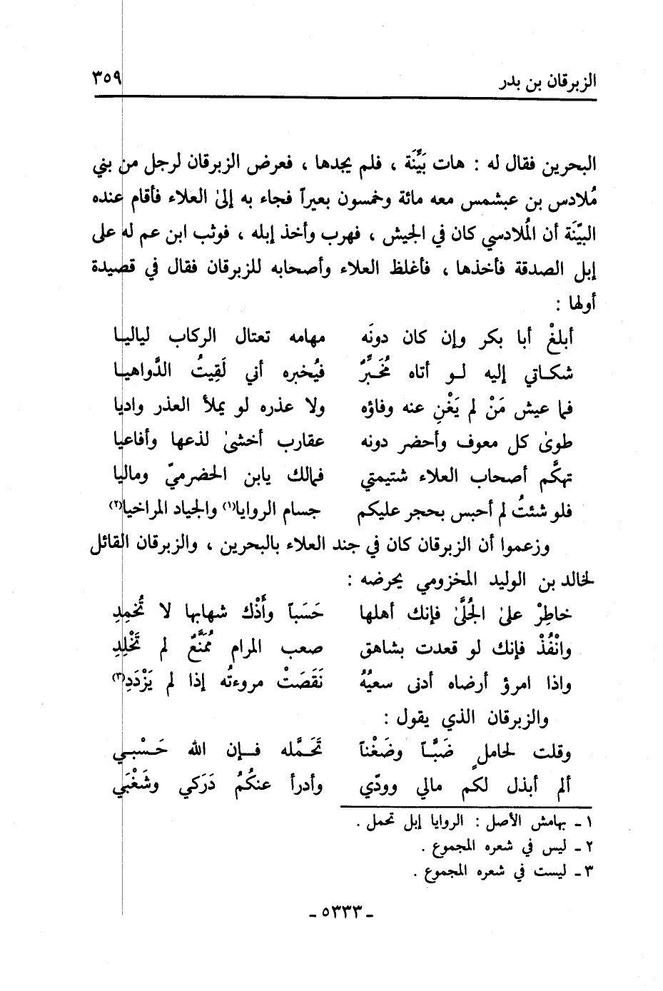 البحرين فقال له: هات بينه، فلم يجدها، فعرض الزبرقان لرجل من بني مُلادس بْن عبشمس معه مائة وخمسون بعيرًا فجاء به إلى العلاء فأقام عنده البينة أن المُلادسي كان في الجيش، فهرب وأخذ إبله، فوثب ابن عم له على إبل الصدقة فأخذها، فأغلظ العلاء وأصحابه للزبرقان فقال فِي قصيدة أولها: