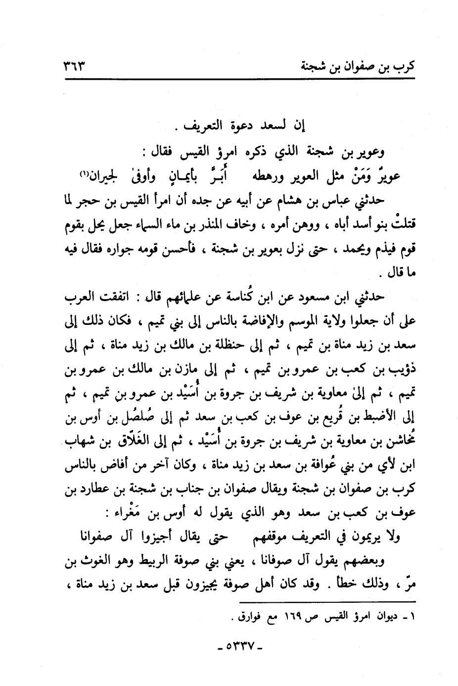 حَدَّثَنِي ابن مَسْعُود عن ابن كُناسة عن علمائهم قال: اتفقت العرب على أن جعلوا ولاية الموسم والإفاضة بالناس إلى بني تميم، فكان ذلك إِلَى سعد بْن زَيْد مناة بْن تميم، ثُمَّ إِلَى حنظلة بْن مالك بْن زَيْد مناة، ثُمَّ إِلَى ذؤيب بْن كعب بْن عمرو بْن تميم، ثُمَّ إِلَى حنظلة بْن مالك بْن زَيْد مناة، ثُمَّ إِلَى ذؤيب بْن كعب بْن عمرو بْن تميم، ثُمَّ إِلَى مازن بْن مالك بْن عَمْرو بْن تميم، ثُمَّ إِلَى مُعَاوِيَة بْن شريف بن جروة بن أسيد بن عمرو بْن تميم، ثُمَّ إِلَى الأضبط بْن قُريع بْن عوف بْن كعب بْن سعد ثُمَّ إِلَى صُلصُل بْن أوس بْن مُخاشن بْن معاوية بن شريف بن جروة بن أسيد، ثُمَّ إلى الغَلّاق بْن شهاب ابن لأي من بني عُوافة بْن سعد بْن زَيْد مناة، وكان آخر من أفاض بالناس كرب بْن صفوان بْن شجنة ويقال صفوان بْن جناب بن شجنة بن عطارد بن عوف بْن كعب بْن سعد وهو الَّذِي يقول له أوس بْن مَغْراء: