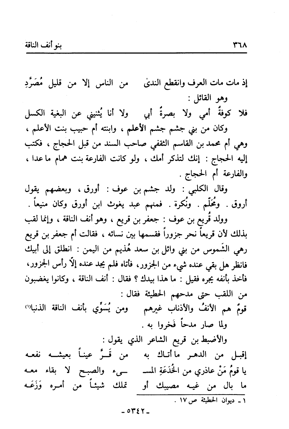 جَعْفَر بْن قريع، وهو أنف الناقة، وإنما لقب بِذَلِك لأن قريعا نحر جزورا فقسمها بين نسائه، فقالت أم جَعْفَر بْن قريع رهي الشموس من بني وائل بْن سعد هُذيم من اليمن: انطلق إِلَى أبيك فانظر هَلْ بقي عنده شيء من الجزور، فأتاه فلم يجد عنده إلّا رأس الجزور، فأخذ بأنفه يجره فَقِيل: ما هَذَا بيدك؟ فقال: أنف الناقة، وكانوا يغضبون من اللقب حَتَّى مدحهم الحطيئة فقال: