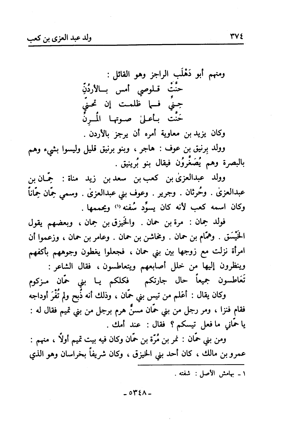 وكان يُقَالُ: أعلم من تيس بني حمان، وذلك أنه ذُبح ولم تُفْرَ أوداجه فقام فنزا، ومر رَجُل من بني حمان مسنُّ هرم برجل من بني تميم فقال له: