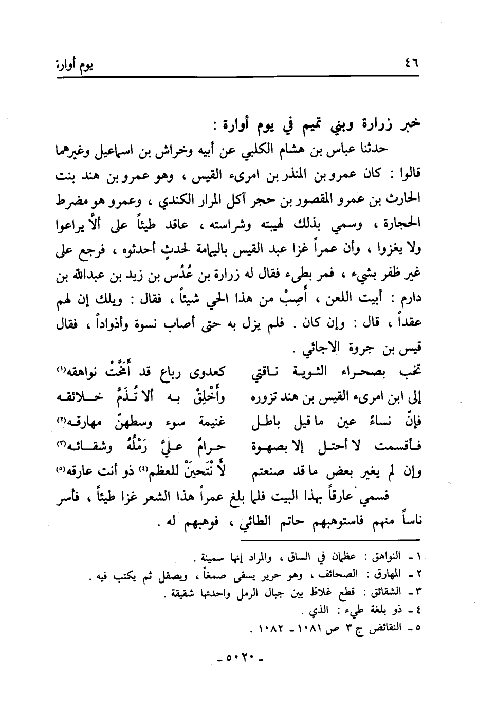 حَدَّثَنَا عَبَّاس بْن هشام الكلبي عن أَبِيهِ وخراش بْن إِسْمَاعِيل وغيرهما قَالُوا: كان عمرو بْن المنذر بْن امرئ القيس، وهو عمرو بْن هند بِنْت الْحَارِث بْن عمرو المقصور بن حجر آكل المرار الكندي، وعمرو هُوَ مضرط الحجارة، وسمي بِذَلِك لهيبته وشراسته، عاقد طيئًا على ألّا يراعوا ولا يغزوا، وأن عمرًا غزا عَبْد القيس باليمامة لحدث أحدثوه، فرجع على غير ظفر بشيء، فمر بطيء فقال له زرارة بْن عُدُس بْن زَيْد بْن عَبْدِ اللَّهِ بْن دارم: أبيت اللعن، أصب من هَذَا الحي شيئًا، فقال: ويلك إن لهم عقدًا، قال: وإن كان. فلم يزل به حَتَّى أصاب نسوة وأذوادًا، فقال قَيْس بْن جروة الأجائي.