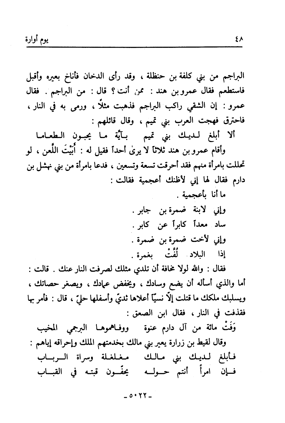 وأقام عمرو بْن هند ثلاثًا لا يرى أحدًا فَقِيل له: أَبَيْتَ اللَّعن، لو تحللت بامرأة منهم فقد أحرقت تسعة وتسعين، فدعا بامرأة من بني نهشل بْن دارم فقال لها إني لأظنك أعجمية فقالت: