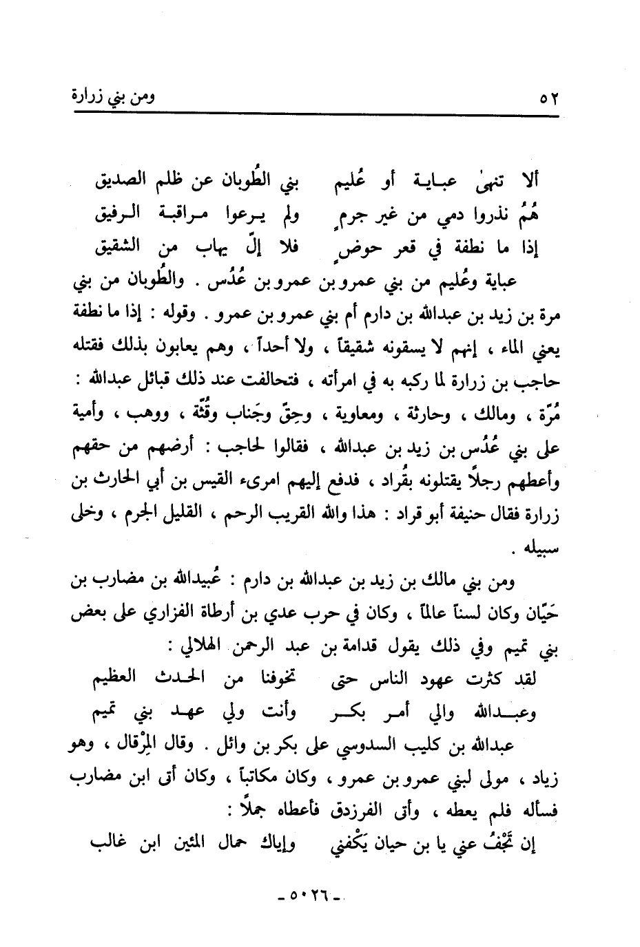 مُرَّة، ومالك، وحارثة، ومعاوية، وحِقّ وجَناب وقُثَّة، ووهب، وأمية على بني عُدُس بْن زَيْد بْن عَبْد اللَّه، فقالوا لحاجب: أرضهم من حقهم وأعطهم رجلًا يقتلونه بقُراد، فدفع إليهم امرئ القيس بْن أَبِي الْحَارِث بْن زرارة فقال حنيفة أبو قراد: هَذَا والله القريب الرحم، القليل الجرم، وخلى سبيله.