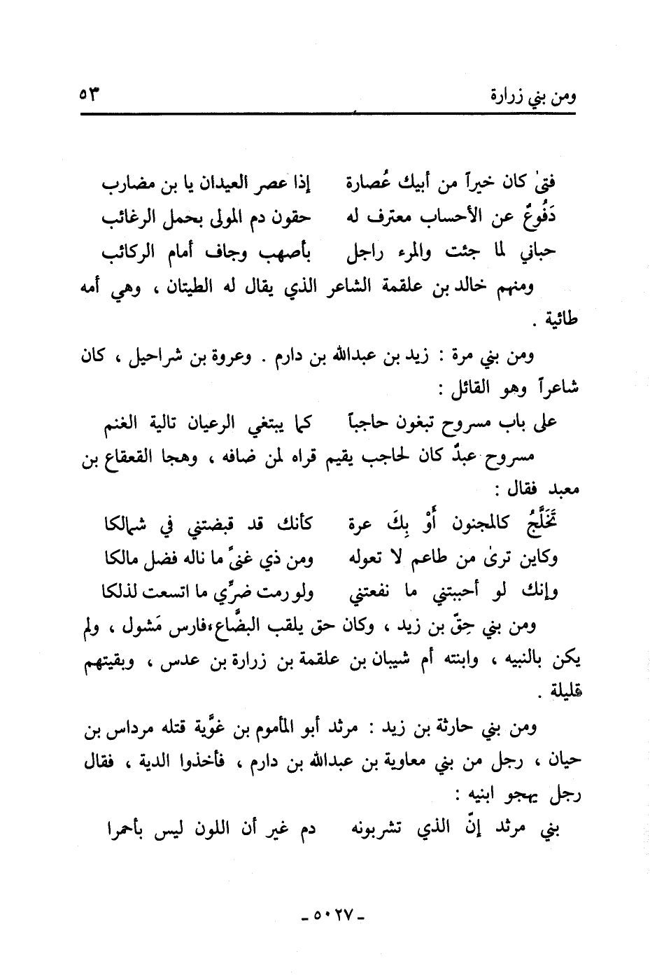 ومن بني مرة: زَيْد بْن عَبْد اللَّه بْن دارم. وعروة بْن شراحيل، كان شاعرًا وهو القائل: