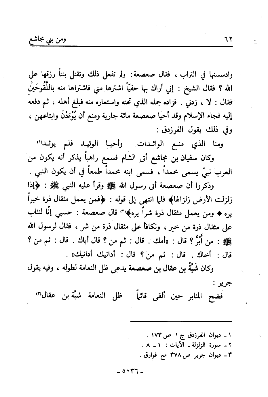 وذكروا أن صعصعة أَتَى رَسُولُ اللَّهِ صَلَّى اللَّهُ عَلَيْهِ وَسَلَّمَ وقرأ عليه النَّبِيّ صَلَّى اللَّهُ عَلَيْهِ وَسَلَّمَ: إِذَا زُلْزِلَتِ الأَرْضُ زِلْزَالَهَا فَلَمَّا انتهى إِلَى قوله: فَمَنْ يَعْمَلْ مِثْقَالَ ذَرَّةٍ خَيْرًا يَرَهُ. وَمَنْ يَعْمَلْ مِثْقَالَ ذَرَّةٍ شَرًّا يره [2] قال صعصعة: حسبي إنّا لنثاب على مثقال ذرة من خير، ونكافأ على مثقال ذرة من شر، فقال لرسول اللَّه صَلَّى اللَّهُ عَلَيْهِ وَسَلَّمَ: من أَبَرُّ؟ قال: «أمك. قال: ثُمَّ من؟ قال أباك. قال: ثُمَّ من؟