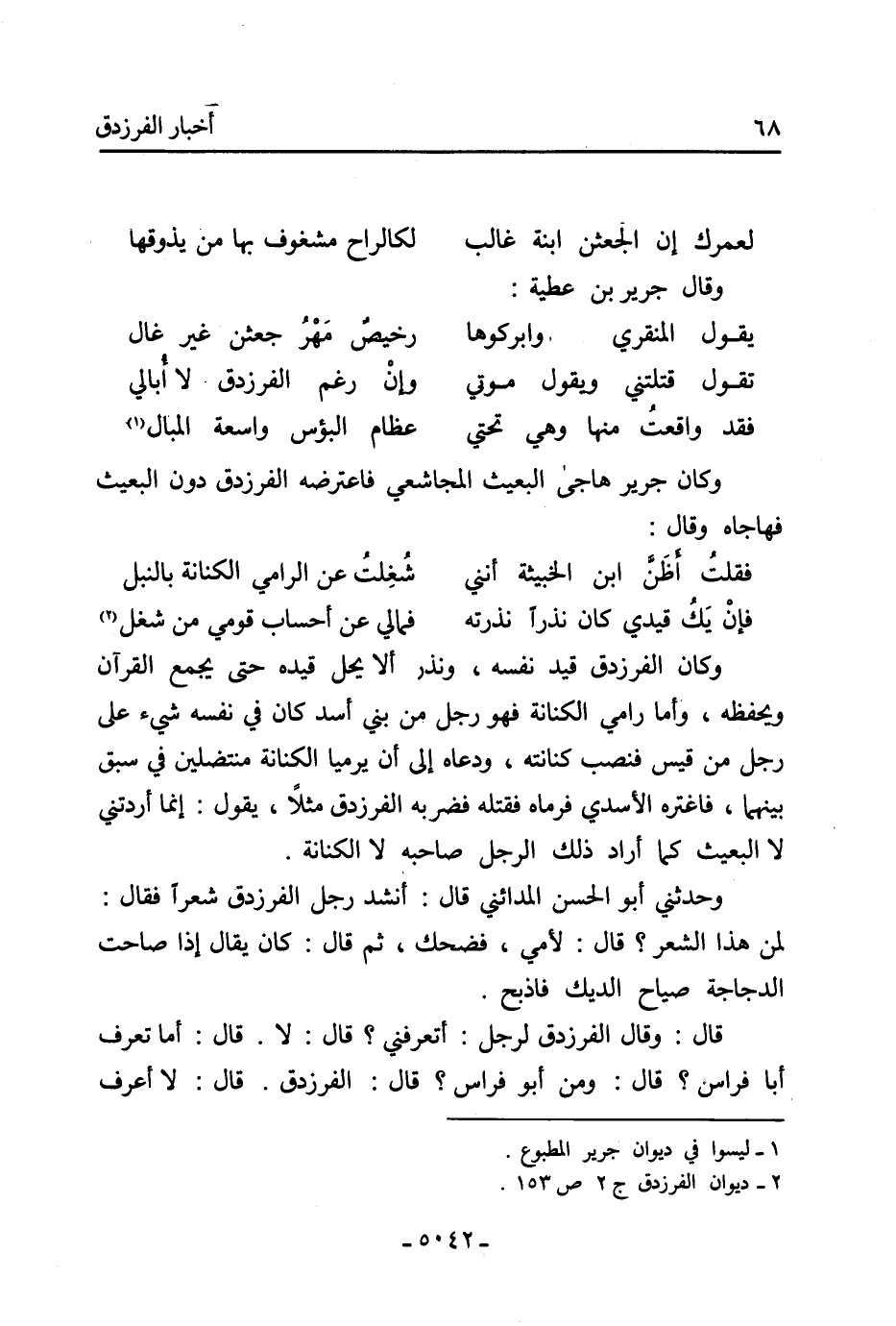 قال: وقال الفرزدق لرجل: أتعرفني؟ قال: لا. قال: أما تعرف أَبَا فراس؟ قال: ومن أَبُو فراس؟ قال: الفرزدق. قال: لا أعرف