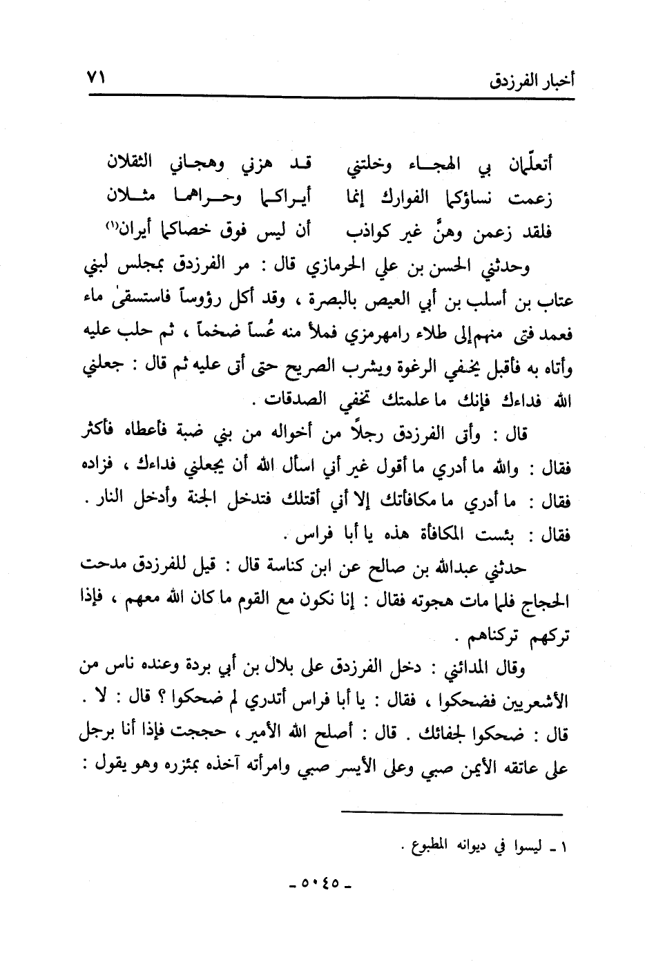 حَدَّثَنِي عَبْدُ اللَّهِ بْنُ صَالِحٍ عَنِ ابْنِ كناسة قال: قيل للفرزدق مدحت الحجاج فَلَمَّا مات هجوته فقال: إنا نكون مع القوم ما كان الله معهم، فإذا تركهم تركناهم.