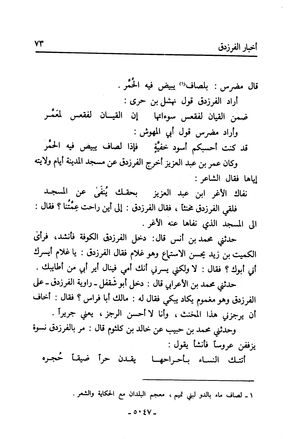 حَدَّثَنِي مُحَمَّد بْن أَنَس قال: دخل الفرزدق الكوفة فأنشد، فرأى الكميت بْن زَيْد يحسن الاستماع وهو غلام فقال الفرزدق: يا غلام أيسرك أني أَبُوك؟ فقال: لا ولكني يسرني أنك أمي فينال أير أَبِي من أطايبك.
