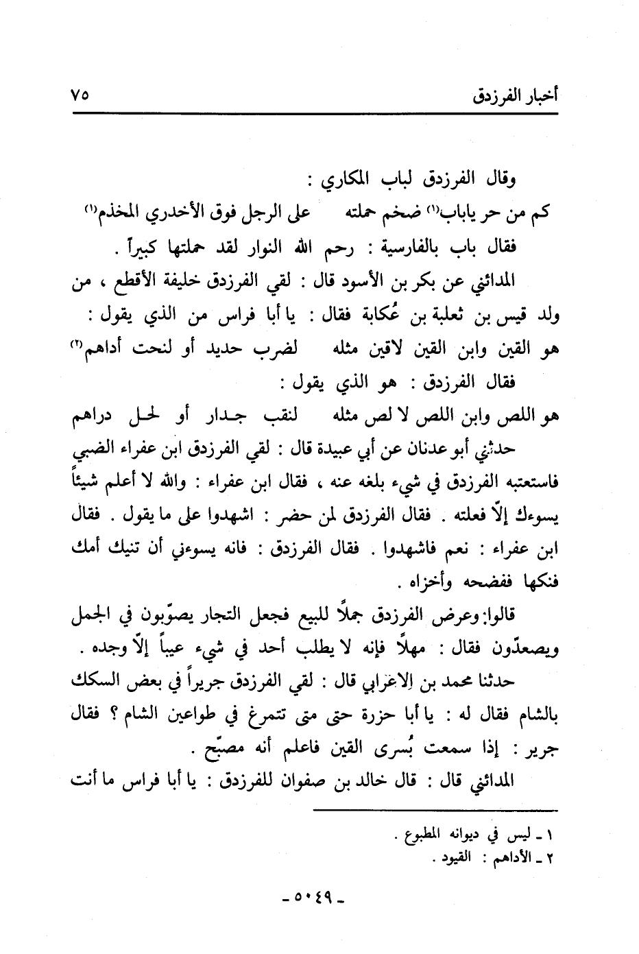 المدائني قال: قال خَالِد بْن صفوان للفرزدق: يا أبا فراس ما أنت