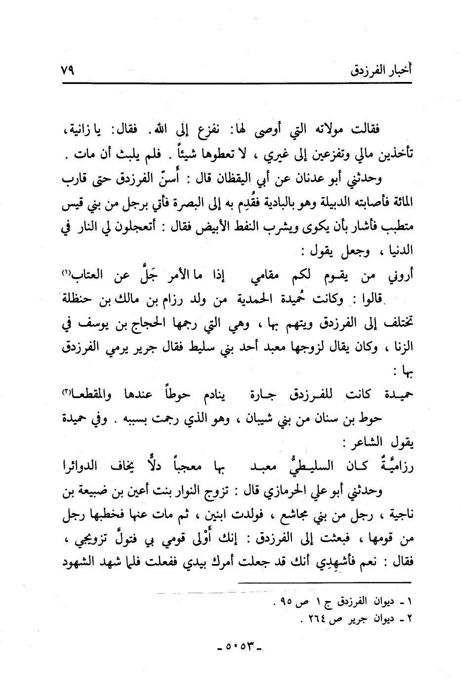 وحدثني أَبُو علي الحرمازي قال: تزوج النوار بِنْت أعين بْن ضبيعة بْن ناجية، رَجُل من بني مجاشع، فولدت ابنين، ثُمَّ مات عَنْهَا فخطبها رَجُل من قومها، فبعثت إِلَى الفرزدق: إنك أَوْلى قومي بي فتولَّ تزويجي، فقال: نعم فأشهِدِي أنك قد جعلت أمرك بيدي ففعلت فلما شهد الشهود