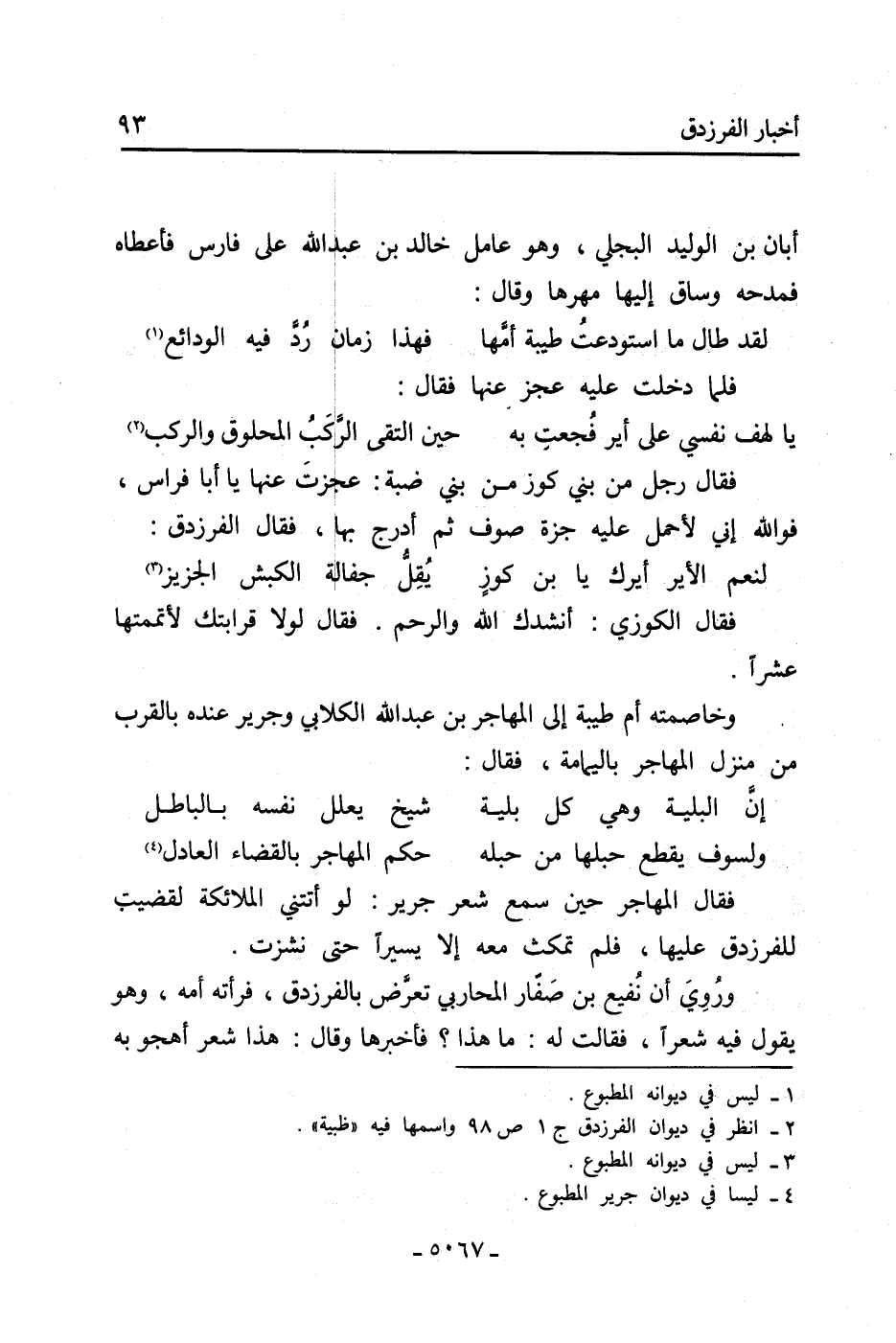 فقال رَجُل من بني كوز من بني ضبة: عجزت عنها يا أبا فراس، فو الله إني لأحمل عليه جزة صوف ثُمَّ أدرج بها، فقال الفرزدق: