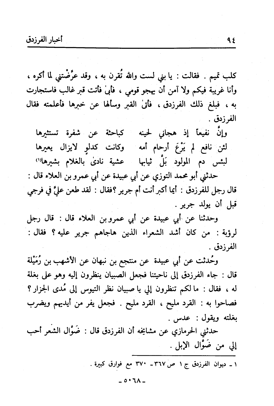 حَدَّثَنِي الحرمازي عن مشايخه أن الفرزدق قال: ضَوَّال الشعر أحب إلي من ضوّال الإبل.