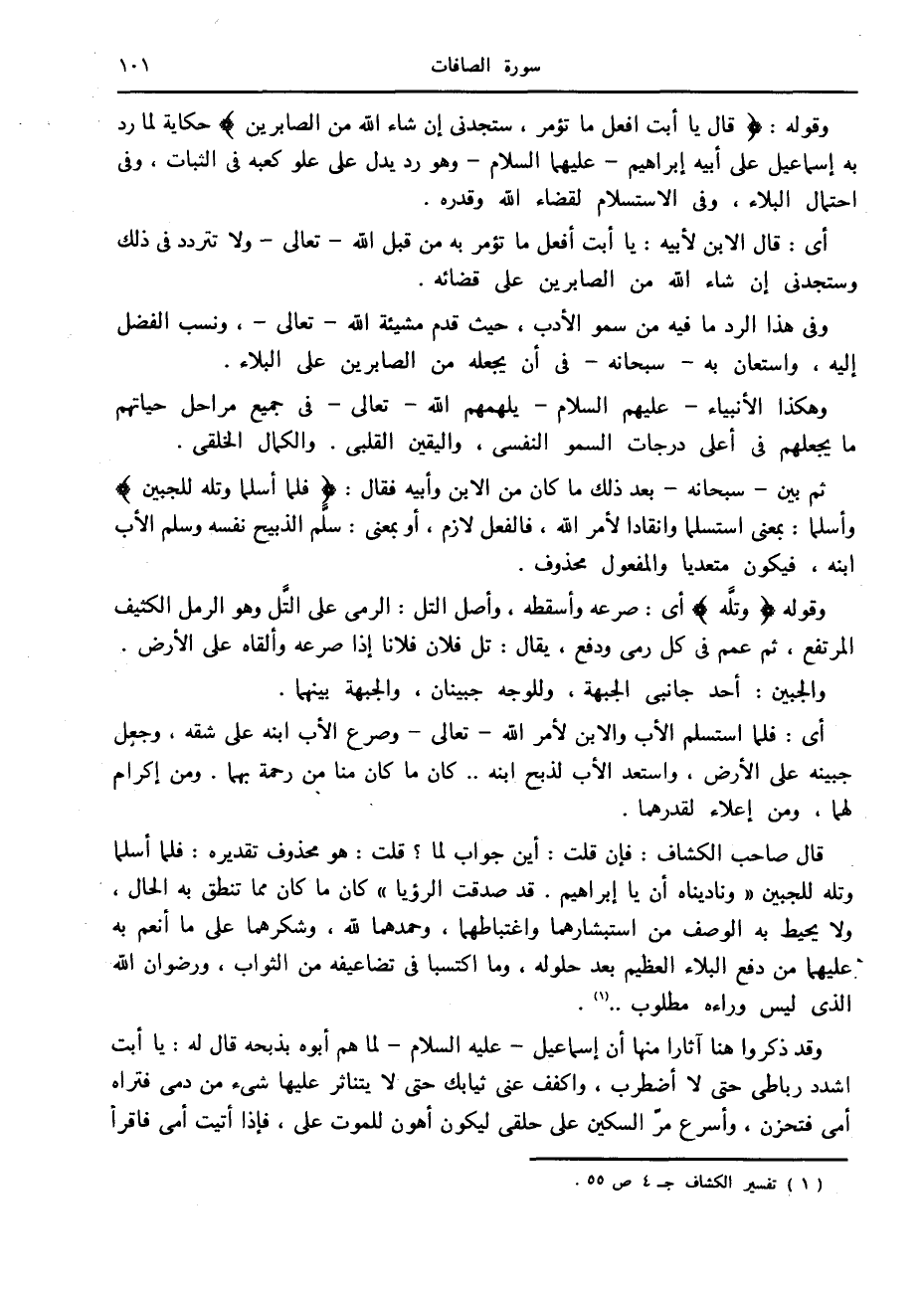 وقد ذكروا هنا آثارا منها أن إسماعيل- عليه السلام- لما هم أبوه بذبحه قال له: يا أبت اشدد رباطى حتى لا أضطرب، واكفف عنى ثيابك حتى لا يتناثر عليها شيء من دمى فتراه أمى فتحزن، وأسرع مرّ السكين على حلقى ليكون أهون للموت على، فإذا أتيت أمى فاقرأ