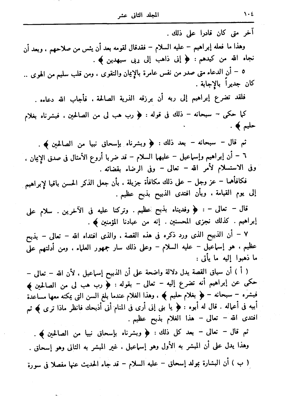 (أ) أن سياق القصة يدل دلالة واضحة على أن الذبيح إسماعيل، لأن الله- تعالى- حكى عن إبراهيم أنه تضرع إليه- تعالى- بقوله: رَبِّ هَبْ لِي مِنَ الصَّالِحِينَ فبشره- سبحانه- بِغُلامٍ حَلِيمٍ، وهذا الغلام عند ما بلغ السن التي يمكنه معها مساعدة أبيه في أعماله. قال له أبوه: يا بُنَيَّ إِنِّي أَرى فِي الْمَنامِ أَنِّي أَذْبَحُكَ فَانْظُرْ ماذا تَرى ثم افتدى الله- تعالى- هذا الغلام بذبح عظيم.