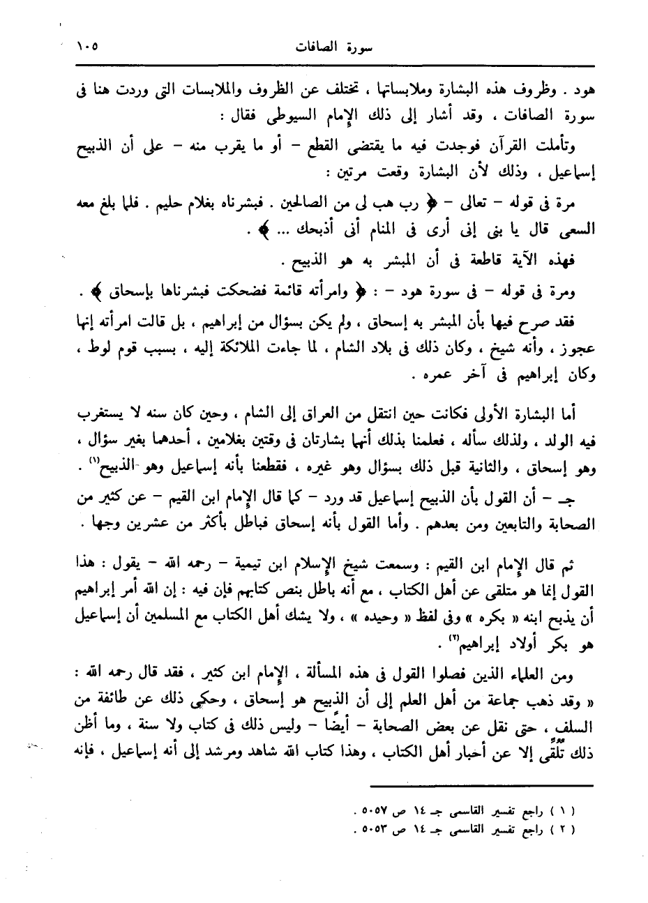 ج- أن القول بأن الذبيح إسماعيل قد ورد- كما قال الإمام ابن القيم- عن كثير من الصحابة والتابعين ومن بعدهم. وأما القول بأنه إسحاق فباطل بأكثر من عشرين وجها.
