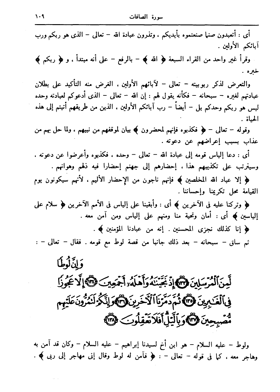 وَإِنَّ لُوطاً لَمِنَ الْمُرْسَلِينَ (133) إِذْ نَجَّيْناهُ وَأَهْلَهُ أَجْمَعِينَ (134) إِلاَّ عَجُوزاً فِي الْغابِرِينَ (135) ثُمَّ دَمَّرْنَا الْآخَرِينَ (136) وَإِنَّكُمْ لَتَمُرُّونَ عَلَيْهِمْ مُصْبِحِينَ (137)