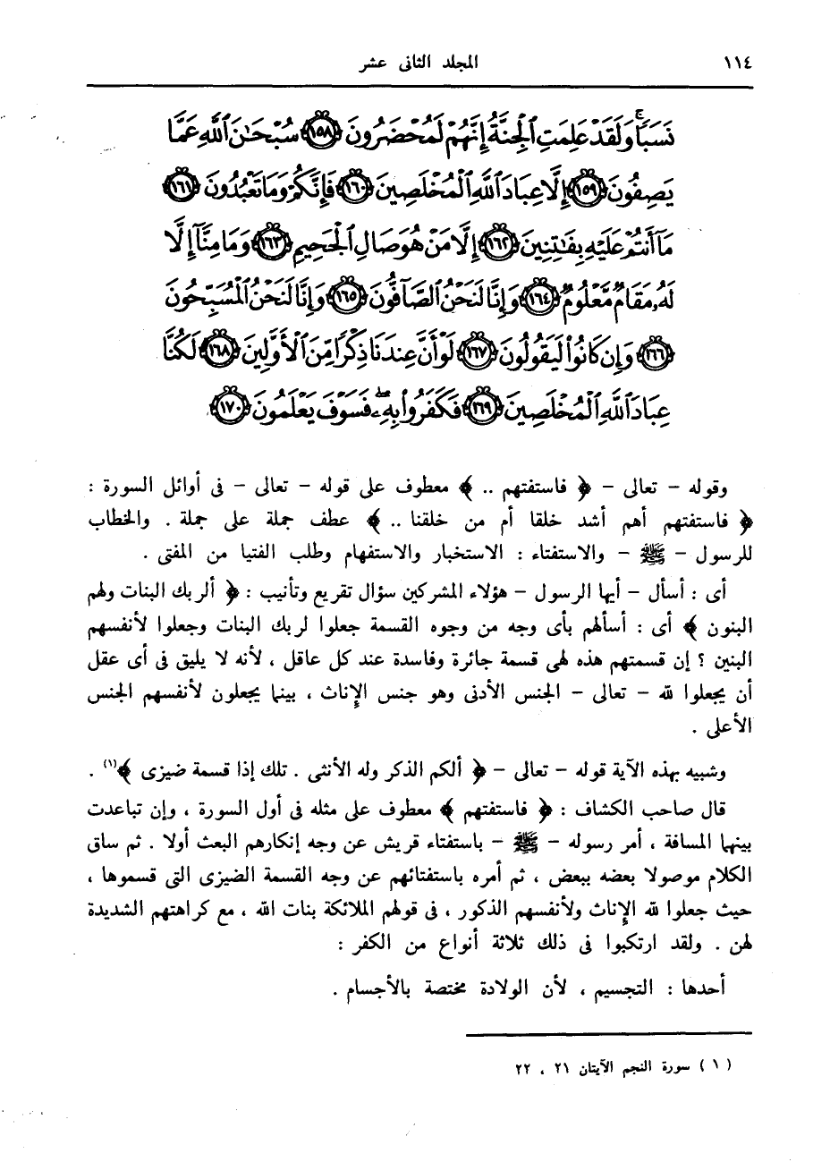 قال صاحب الكشاف: فَاسْتَفْتِهِمْ معطوف على مثله في أول السورة، وإن تباعدت بينهما المسافة، أمر رسوله صلّى الله عليه وسلم باستفتاء قريش عن وجه إنكارهم البعث أولا. ثم ساق الكلام موصولا بعضه ببعض، ثم أمره باستفتائهم عن وجه القسمة الضيزى التي قسموها، حيث جعلوا لله الإناث ولأنفسهم الذكور، في قولهم الملائكة بنات الله، مع كراهتهم الشديدة لهن. ولقد ارتكبوا في ذلك ثلاثة أنواع من الكفر: