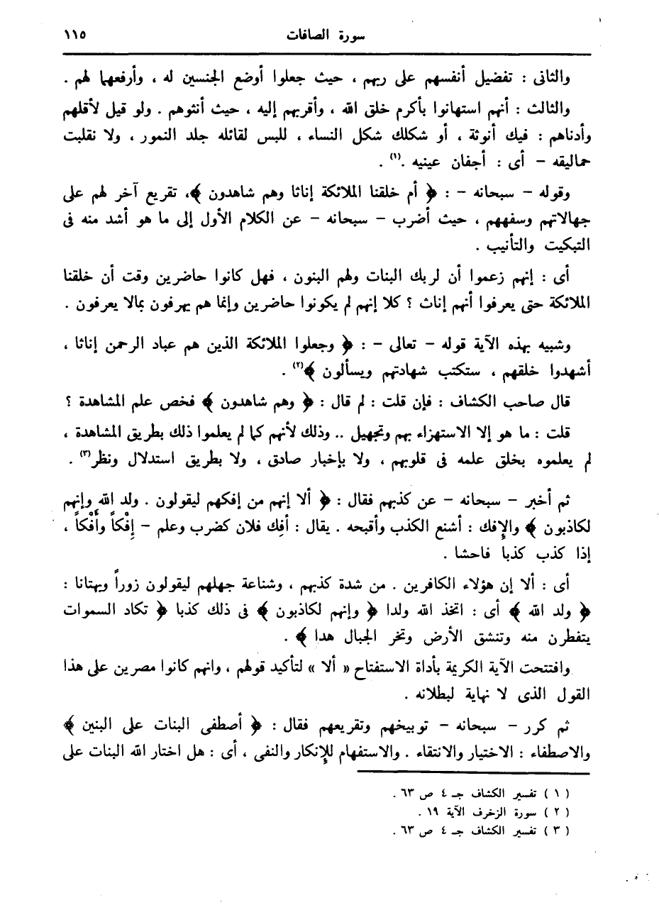 وقوله- سبحانه-: أَمْ خَلَقْنَا الْمَلائِكَةَ إِناثاً وَهُمْ شاهِدُونَ، تقريع آخر لهم على جهالاتهم وسفههم، حيث أضرب- سبحانه- عن الكلام الأول إلى ما هو أشد منه في التبكيت والتأنيب.