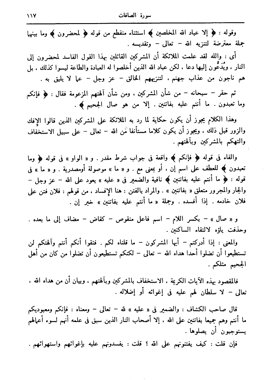 قال صاحب الكشاف: والضمير في «عليه» لله- تعالى- ومعناه: فإنكم ومعبوديكم ما أنتم وهم جميعا بفاتنين على الله، إلا أصحاب النار الذين سبق في علمه أنهم لسوء أعمالهم يستوجبون أن يصلوها.
