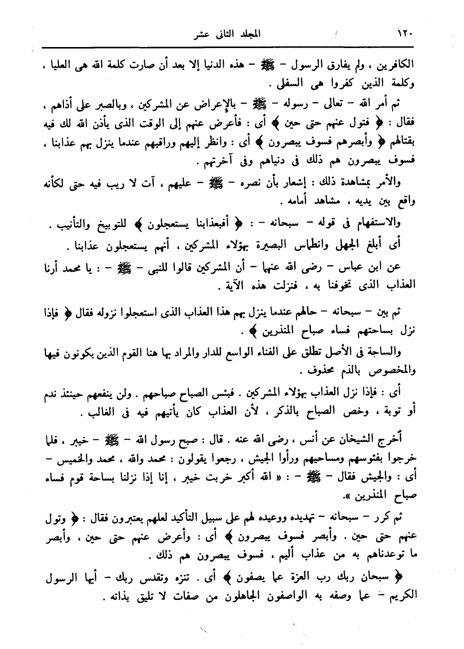 أخرج الشيخان عن أنس، رضى الله عنه. قال: صبح رسول الله صلّى الله عليه وسلم خيبر، فلما خرجوا بفئوسهم ومساحيهم ورأوا الجيش، رجعوا يقولون: محمد والله، محمد والخميس- أى: والجيش فقال صلّى الله عليه وسلم: «الله أكبر خربت خيبر، إنا إذا نزلنا بساحة قوم فساء صباح المنذرين» .