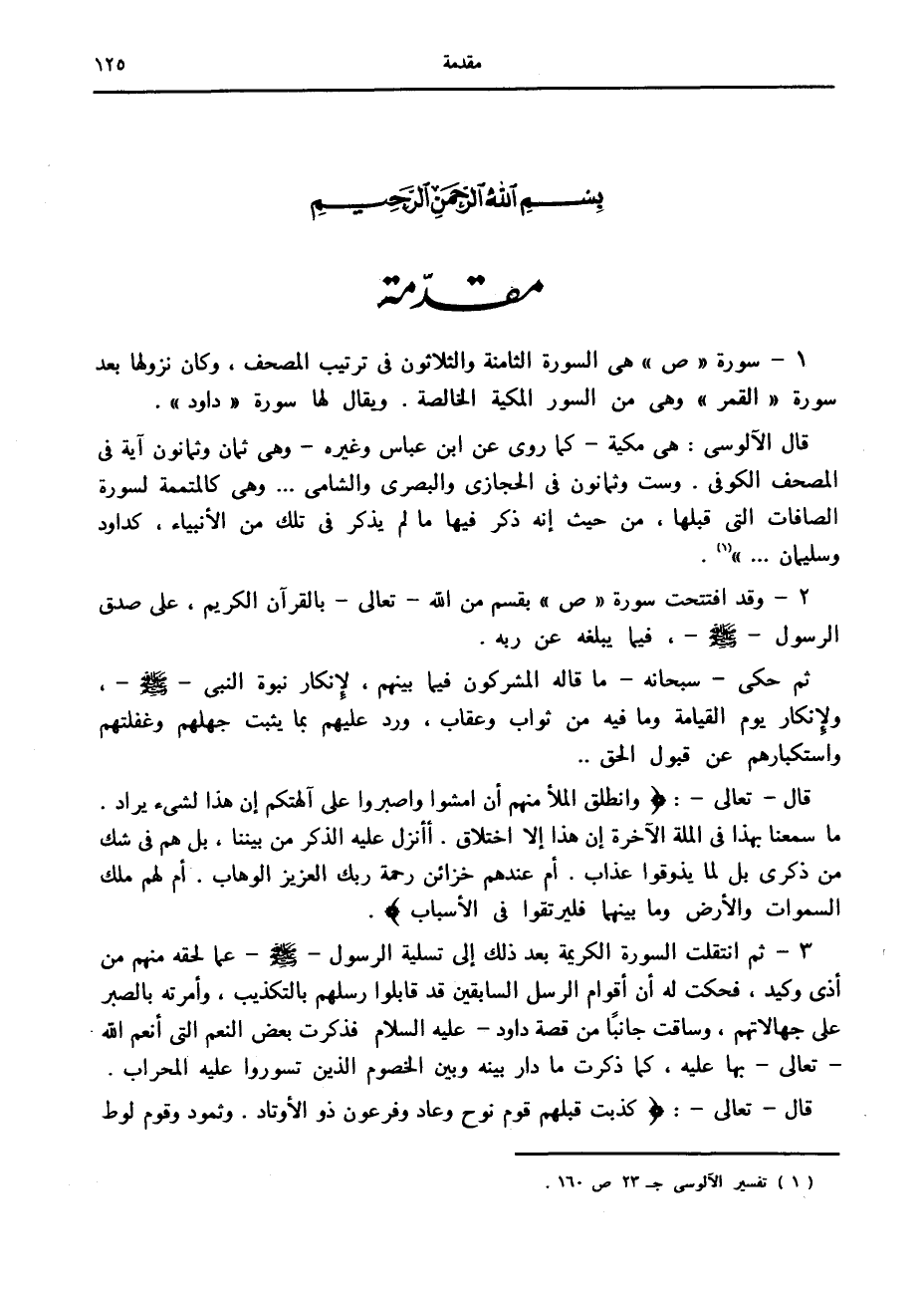 1- سورة «ص» هي السورة الثامنة والثلاثون في ترتيب المصحف، وكان نزولها بعد سورة «القمر» وهي من السور المكية الخالصة. ويقال لها سورة «داود» .