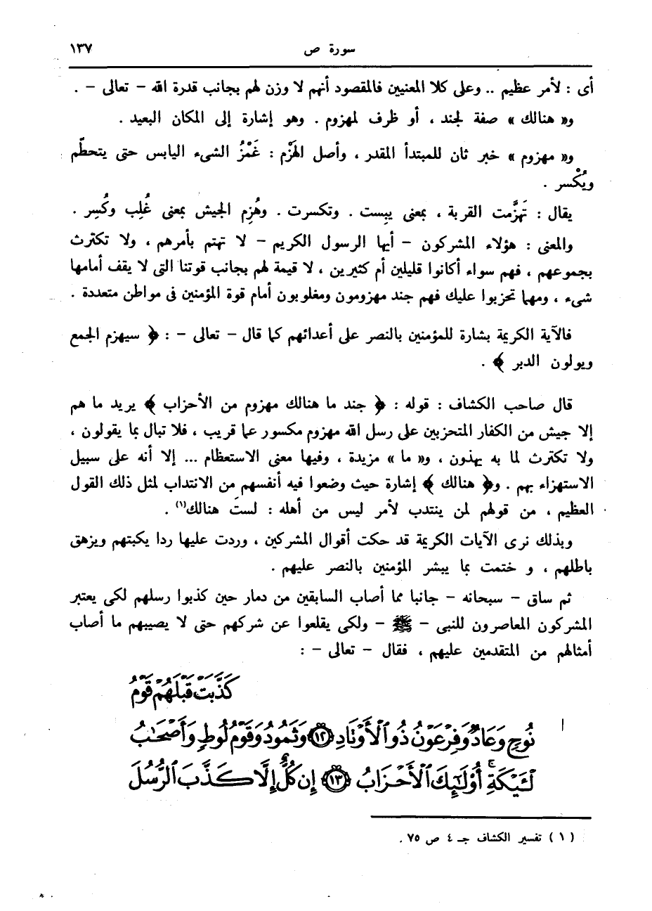 قال صاحب الكشاف: قوله: جُنْدٌ ما هُنالِكَ مَهْزُومٌ مِنَ الْأَحْزابِ يريد ما هم إلا جيش من الكفار المتحزبين على رسل الله مهزوم مكسور عما قريب، فلا تبال بما يقولون، ولا تكترث لما به يهذون، و «ما» مزيدة، وفيها معنى الاستعظام ... إلا أنه على سبيل الاستهزاء بهم. وهُنالِكَ إشارة حيث وضعوا فيه أنفسهم من الانتداب لمثل ذلك القول العظيم، من قولهم لمن ينتدب لأمر ليس من أهله: لست هنالك «1» .