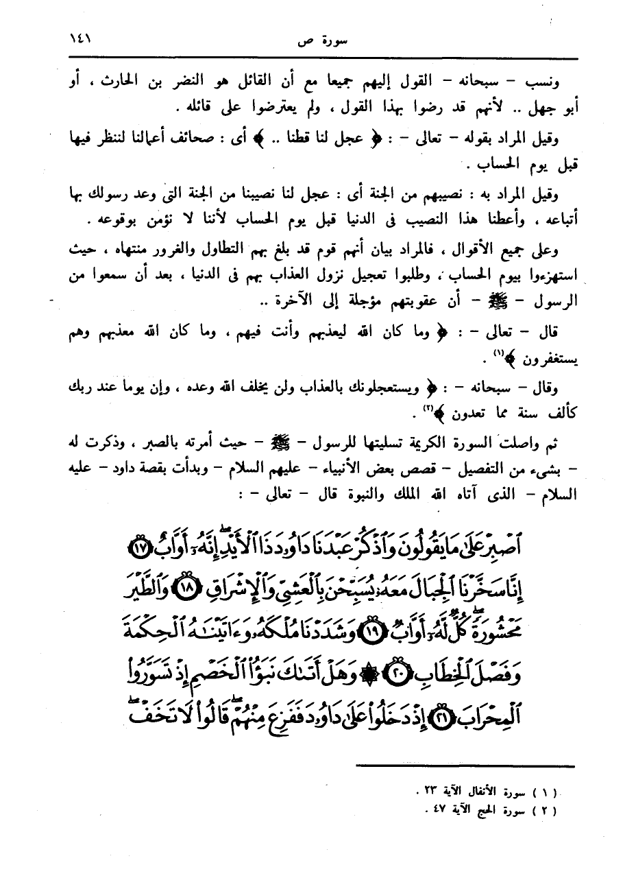ثم واصلت السورة الكريمة تسليتها للرسول صلّى الله عليه وسلم حيث أمرته بالصبر، وذكرت له- بشيء من التفصيل- قصص بعض الأنبياء- عليهم السلام- وبدأت بقصة داود- عليه السلام- الذي آتاه الله الملك والنبوة قال- تعالى-: