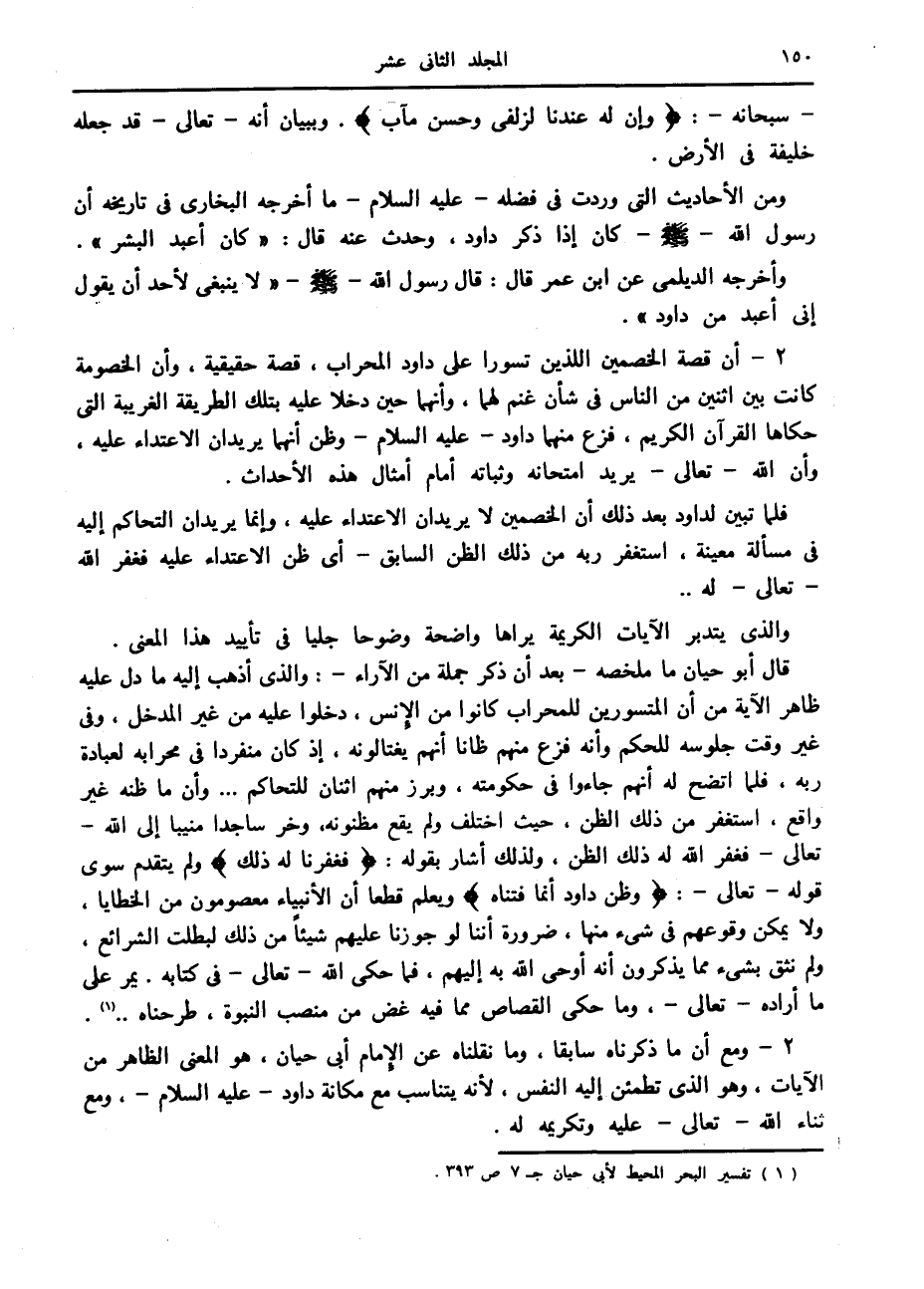 2- أن قصة الخصمين اللذين تسورا على داود المحراب، قصة حقيقية، وأن الخصومة كانت بين اثنين من الناس في شأن غنم لهما، وأنهما حين دخلا عليه بتلك الطريقة الغريبة التي حكاها القرآن الكريم، فزع منها داود- عليه السلام- وظن أنهما يريدان الاعتداء عليه، وأن الله- تعالى- يريد امتحانه وثباته أمام أمثال هذه الأحداث.